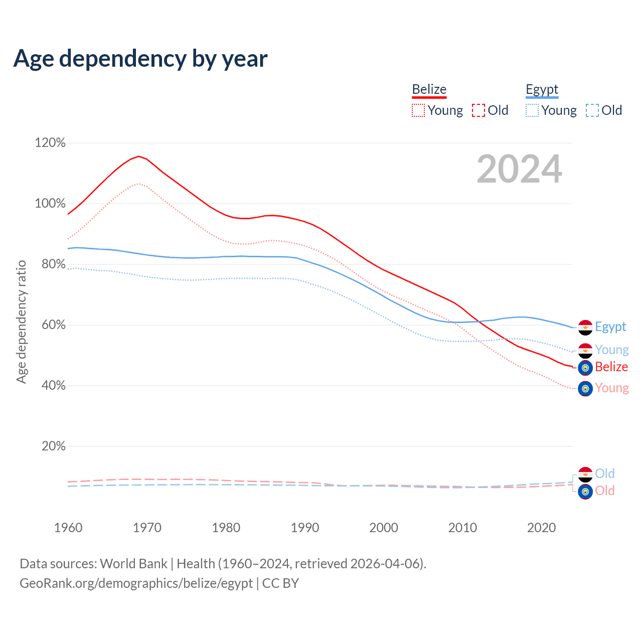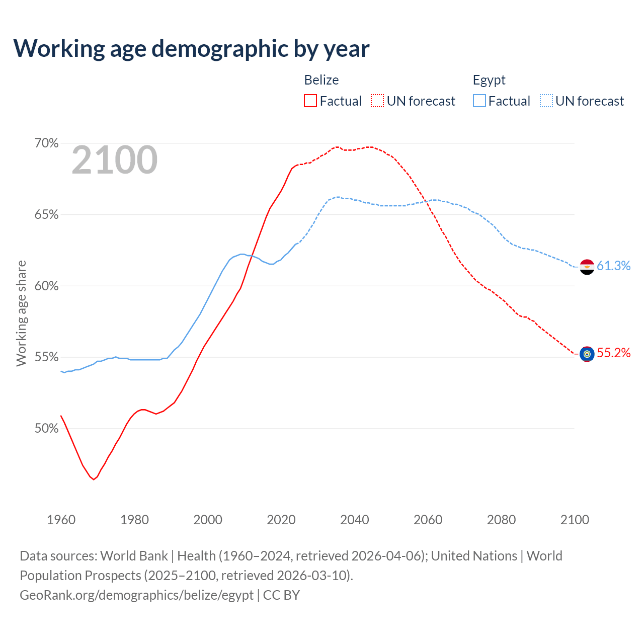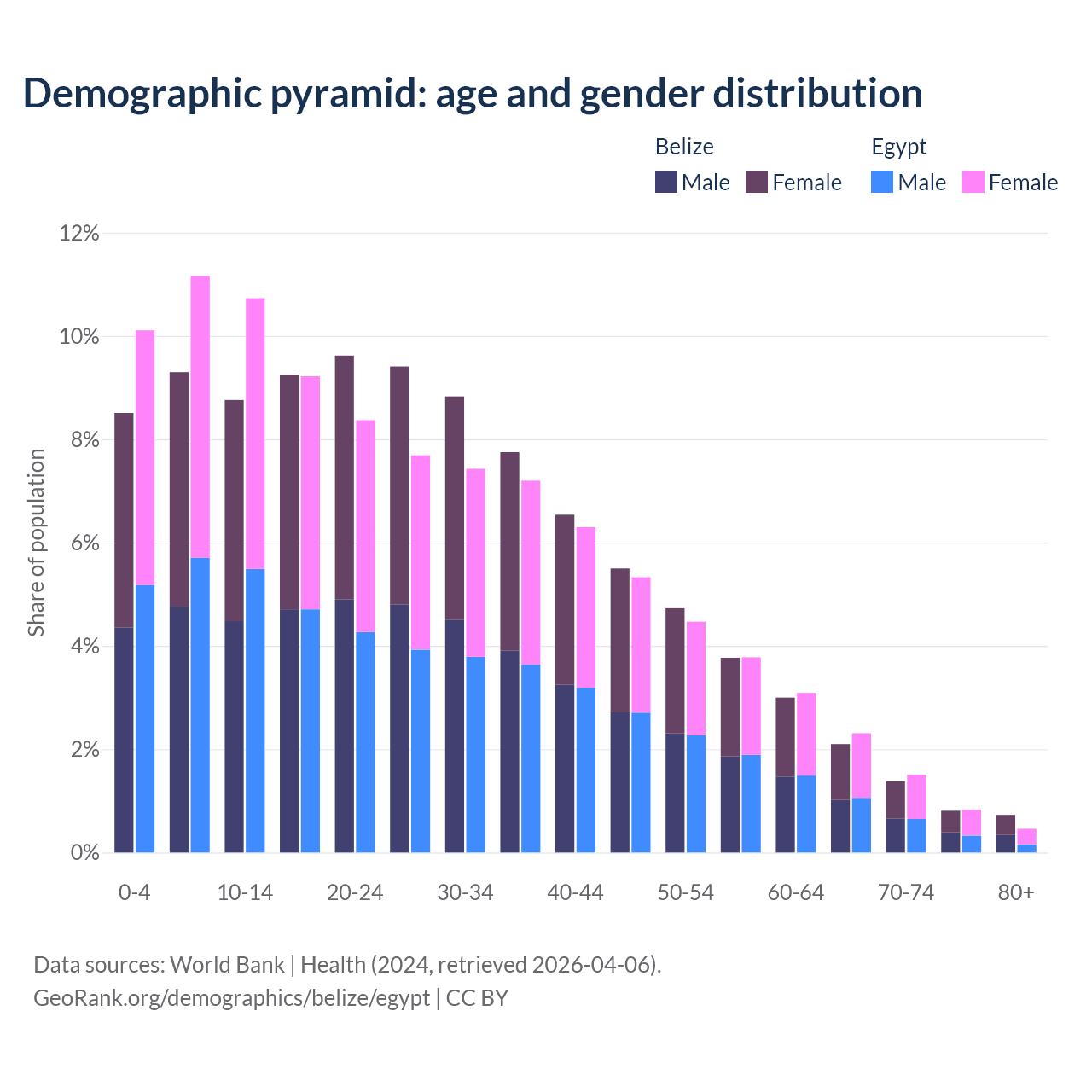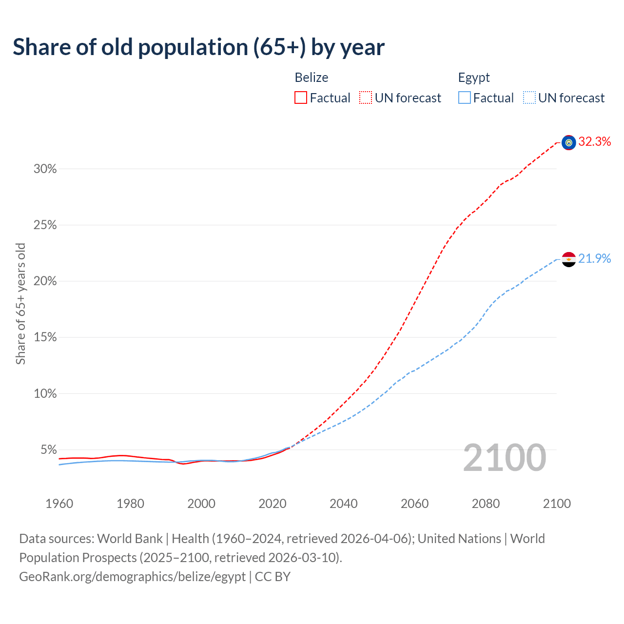 - The share of old-age demographic (65+) in Belize is 5.02% vs 5.12% in Egypt.