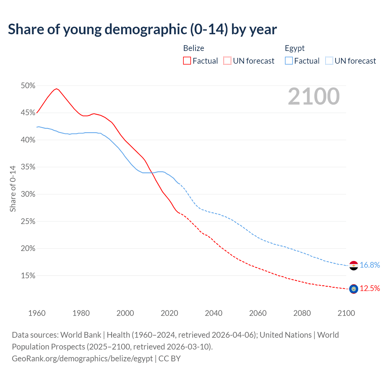 - The share of young demographic (0-15 years old) in Belize is 26.6% vs 32% in Egypt.