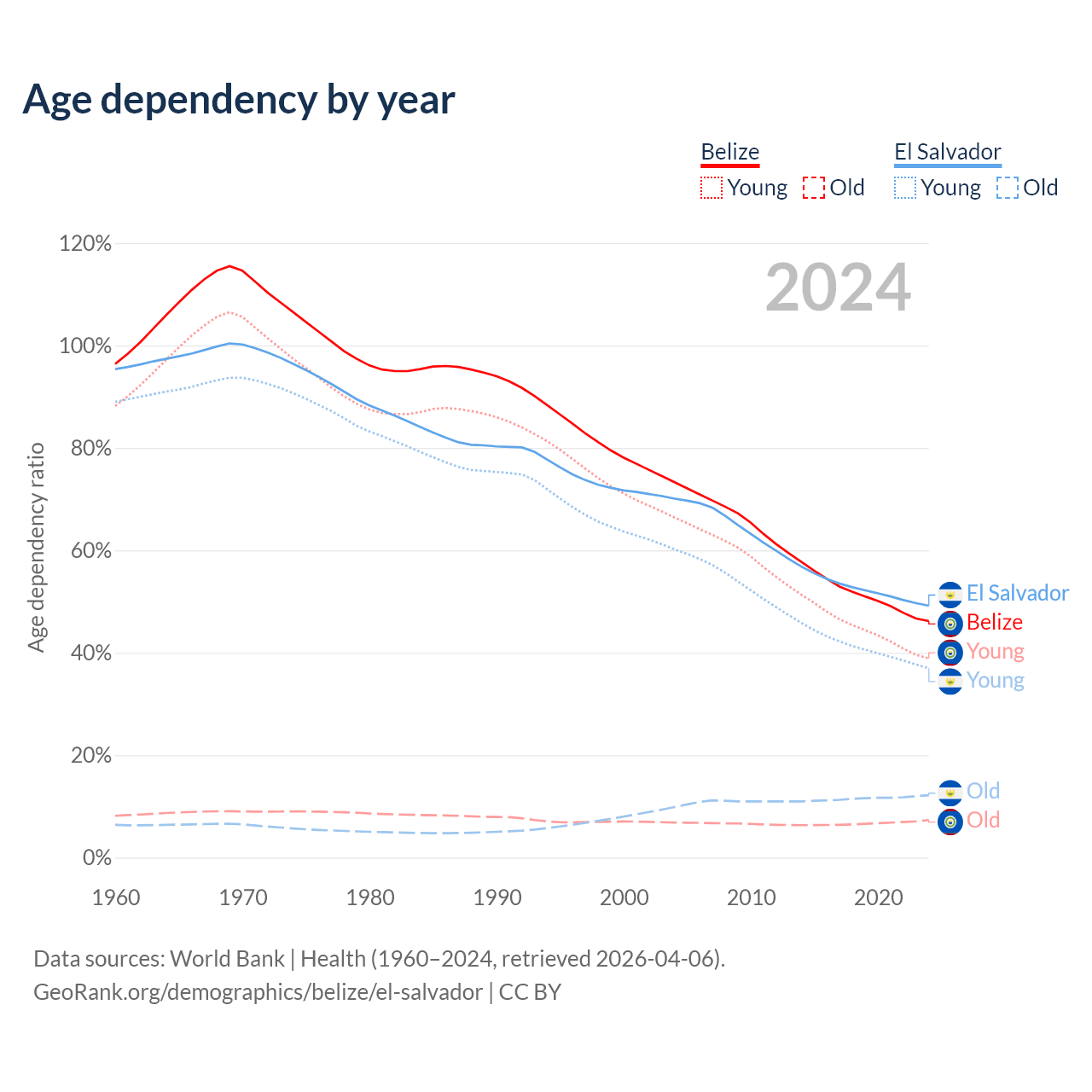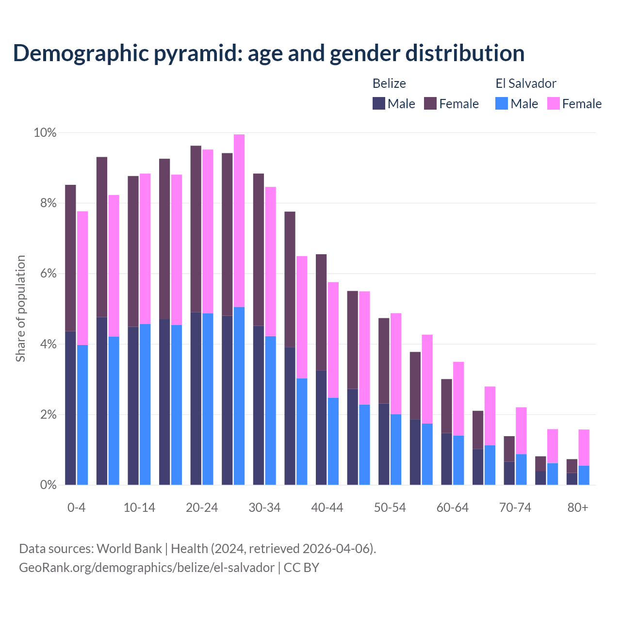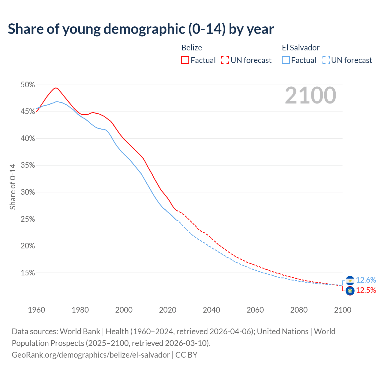 - The share of young demographic (0-15 years old) in Belize is 26.6% vs 24.8% in El Salvador.