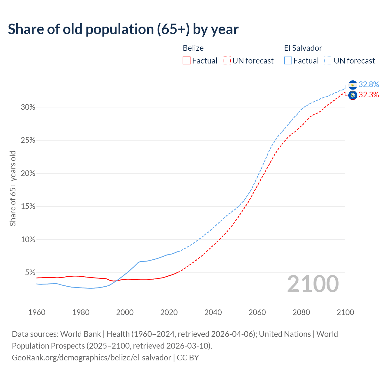 - The share of old-age demographic (65+) in Belize is 5.02% vs 8.15% in El Salvador.
