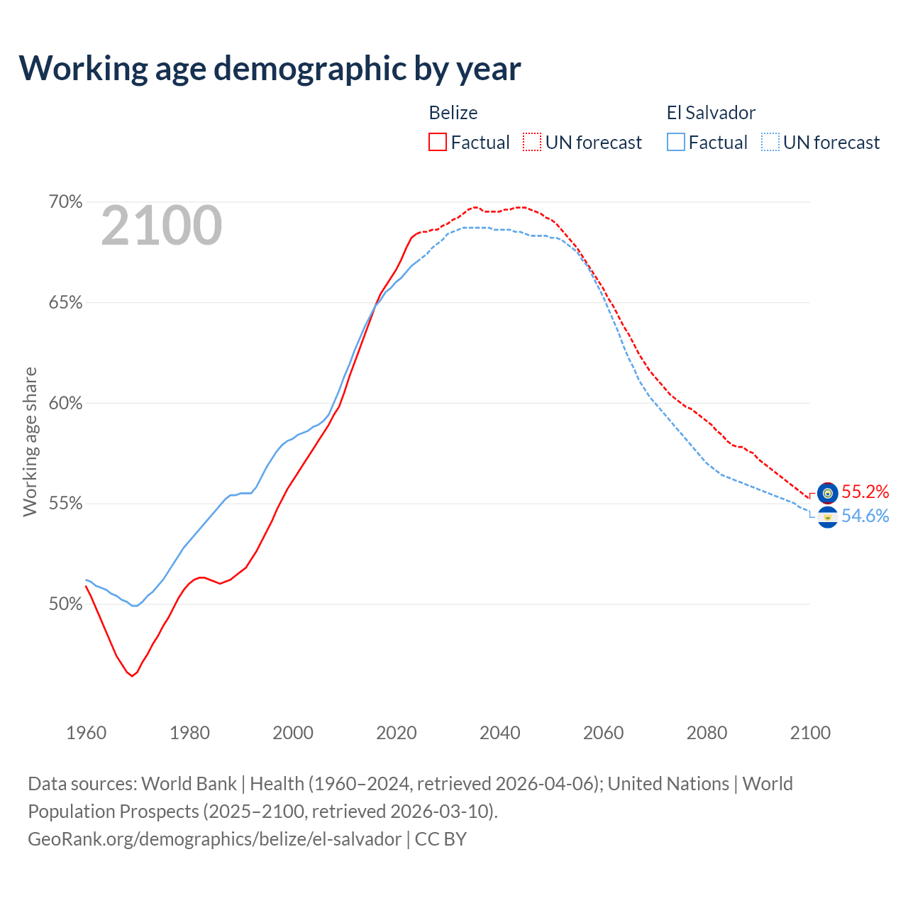Median age Belize vs El Salvador, 1960-2100