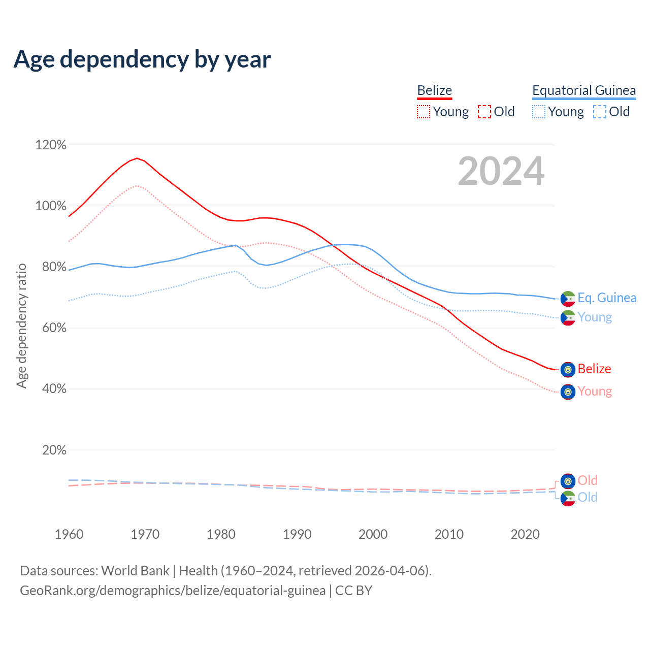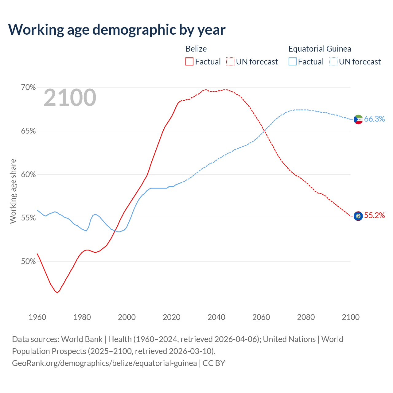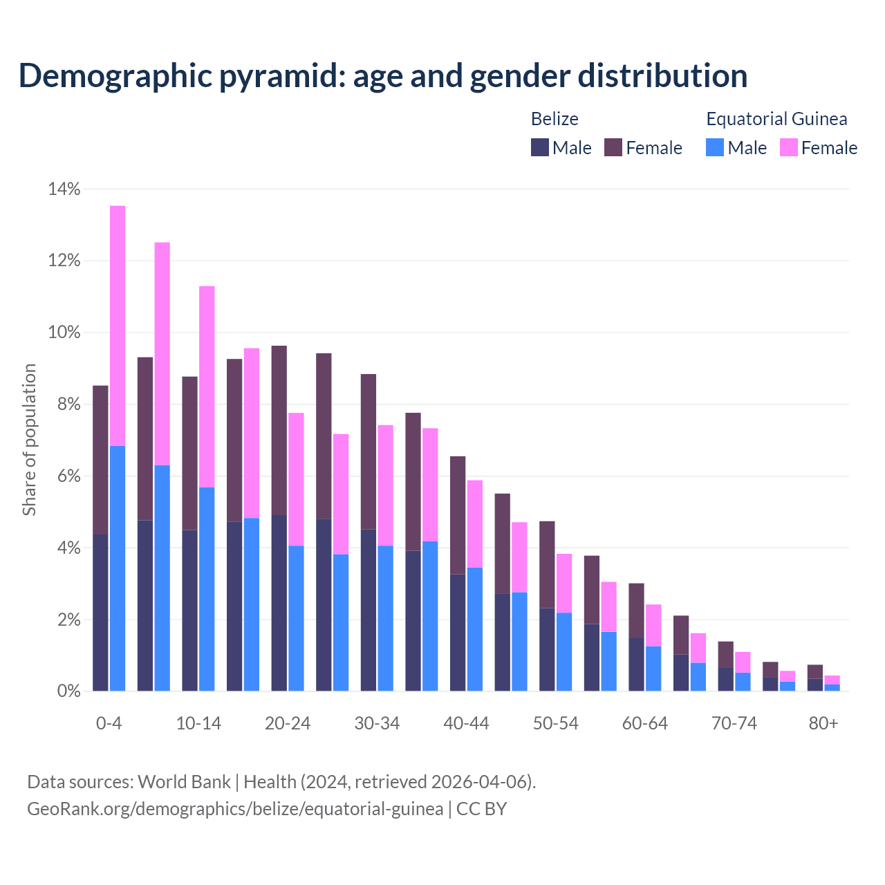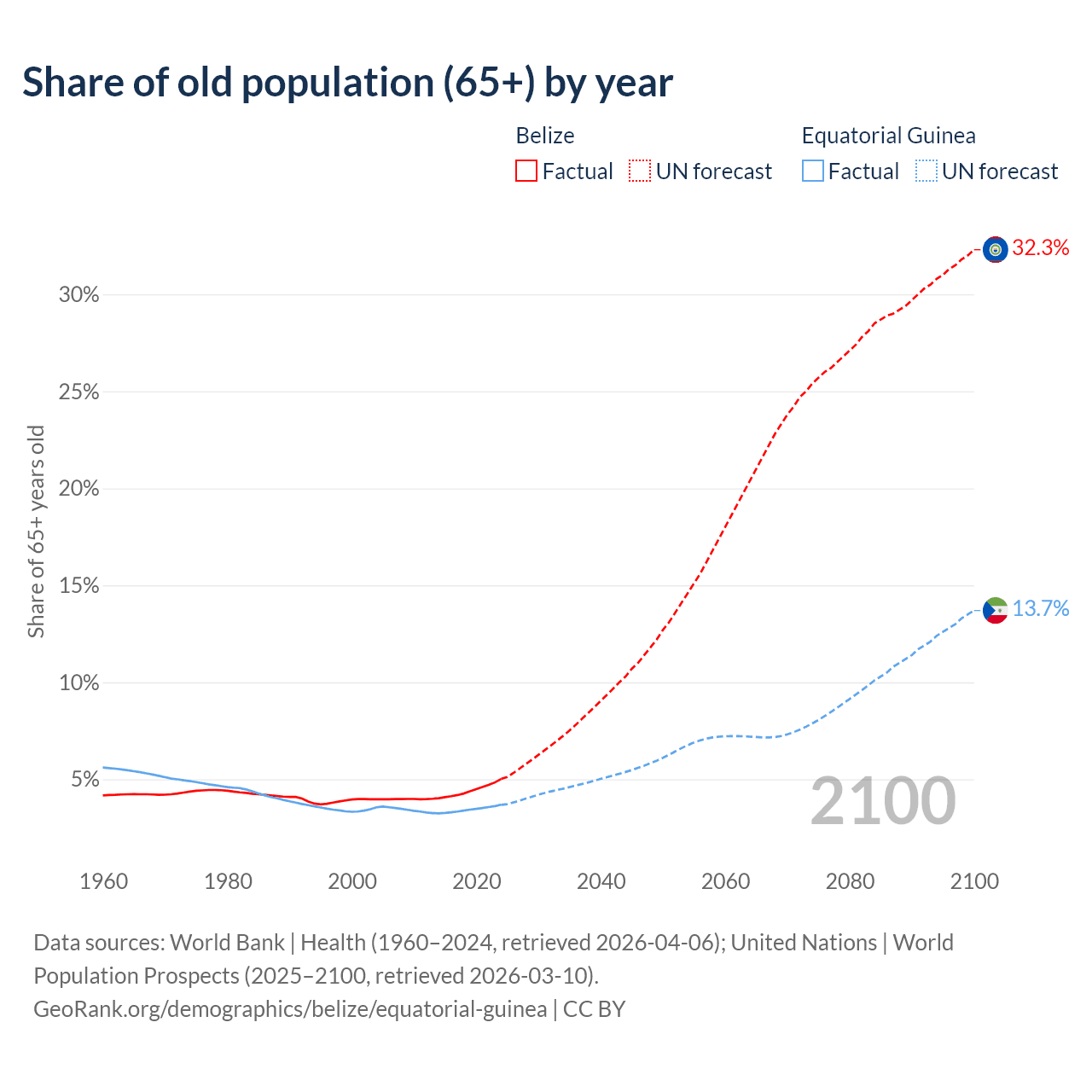 - The share of old-age demographic (65+) in Belize is 5.02% vs 3.69% in Equatorial Guinea.