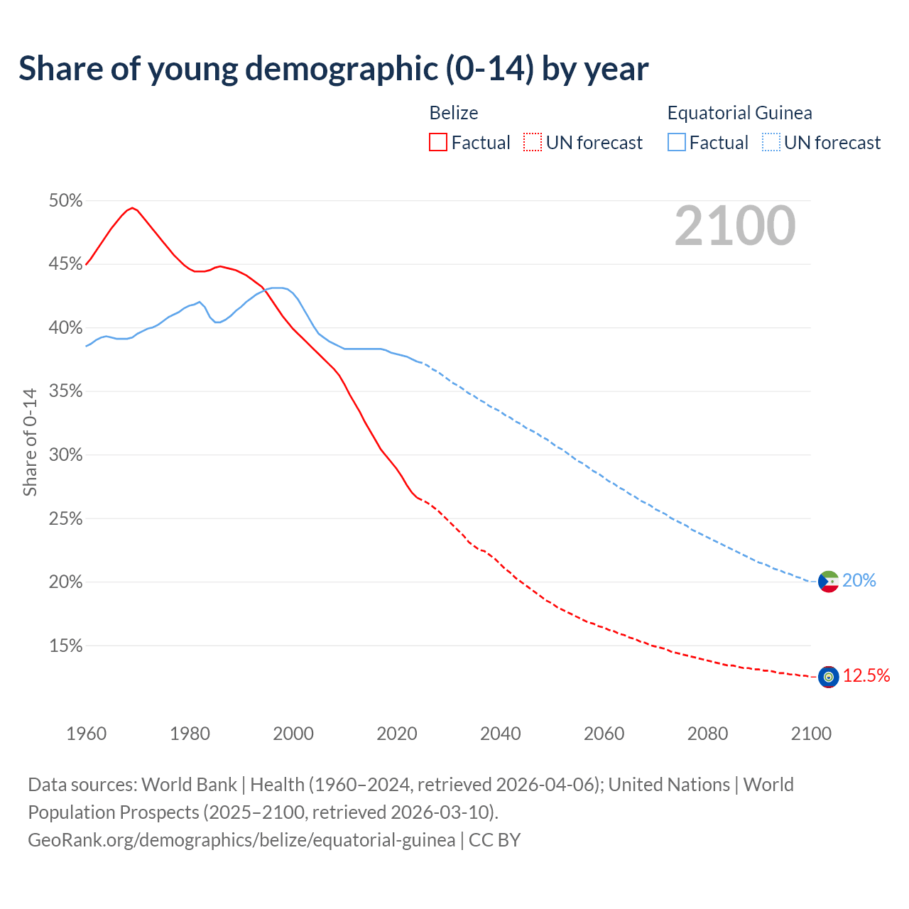 - The share of young demographic (0-15 years old) in Belize is 26.6% vs 37.3% in Equatorial Guinea.