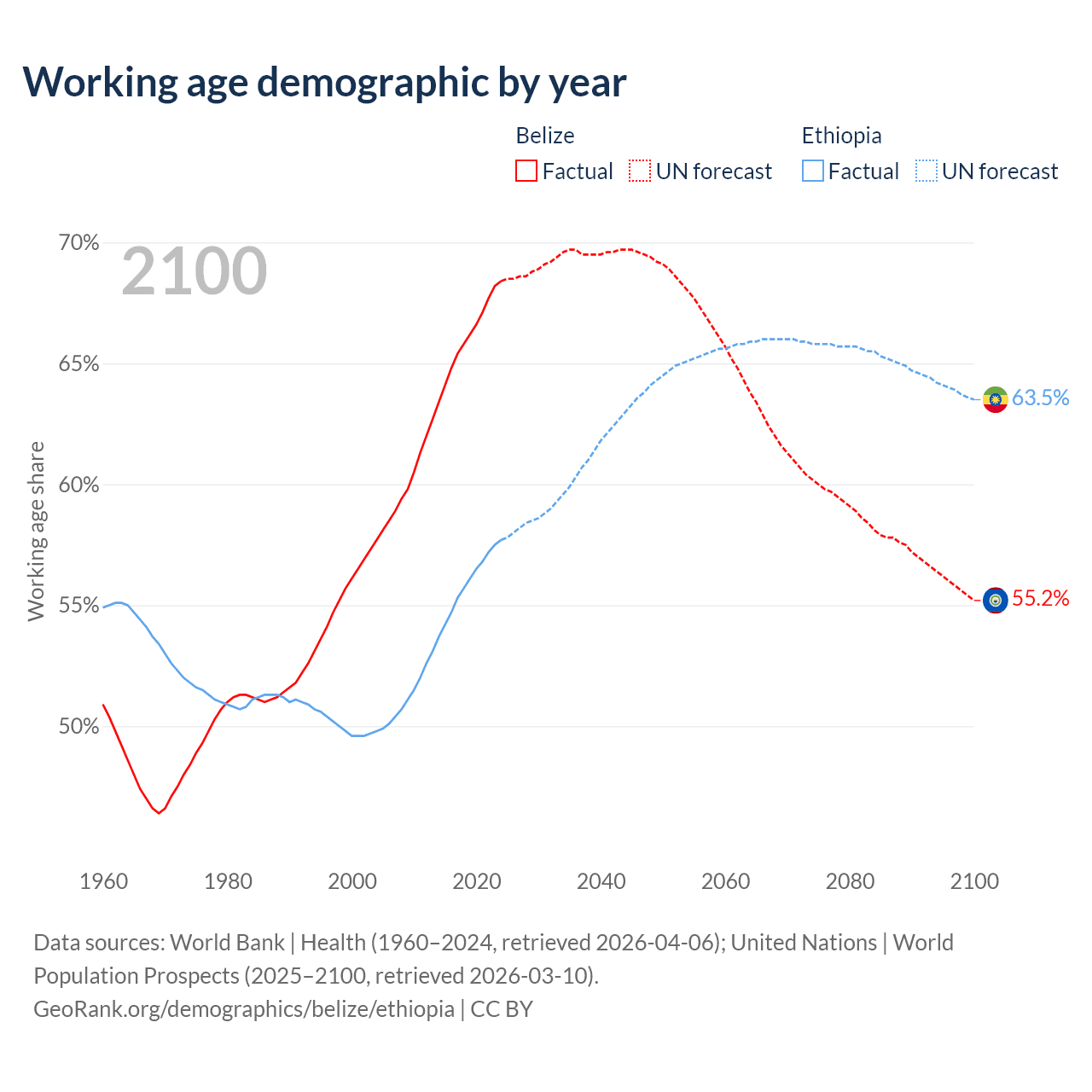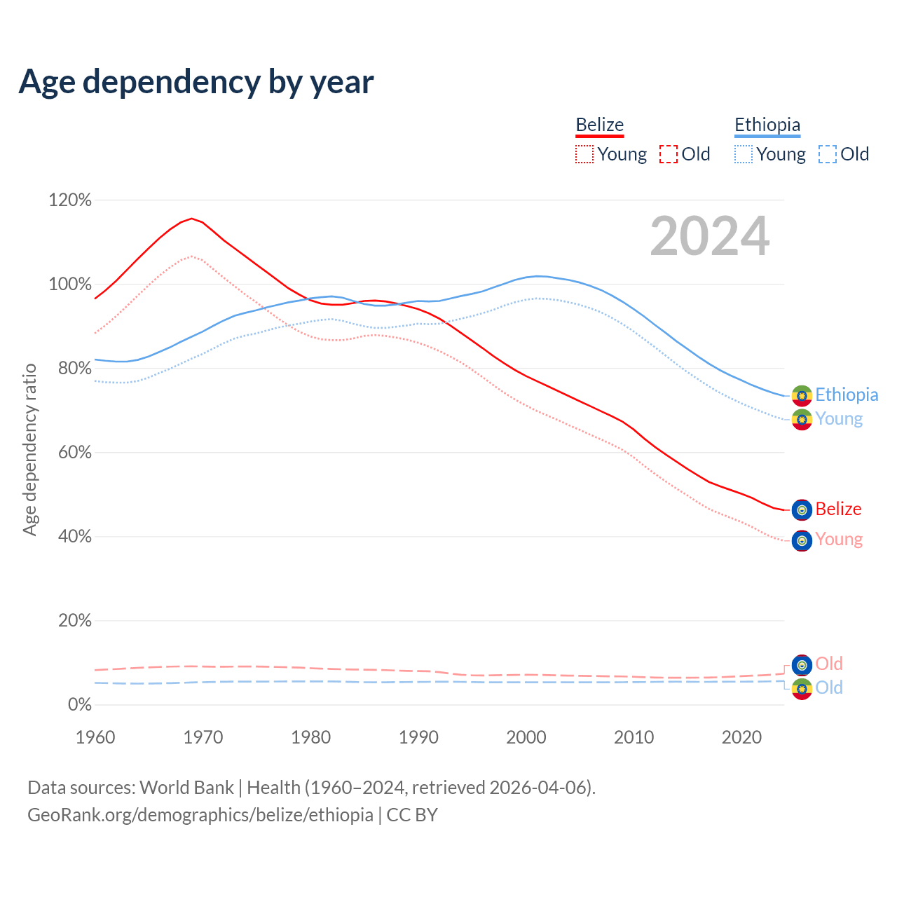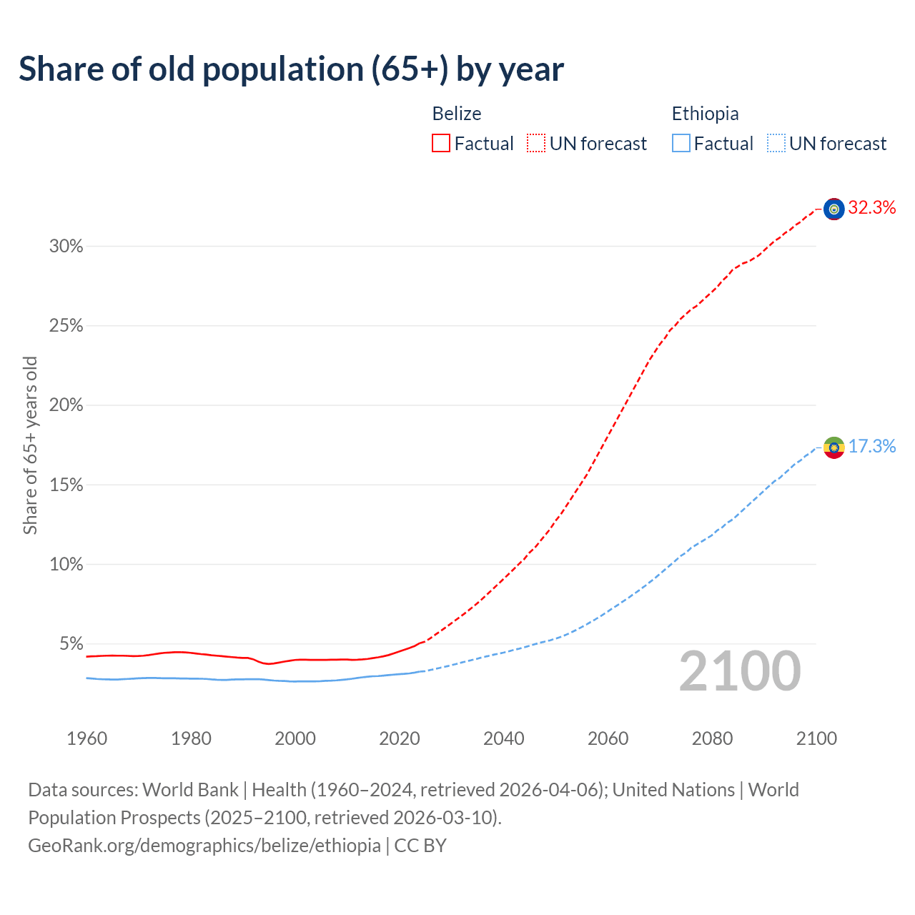 - The share of old-age demographic (65+) in Belize is 5.02% vs 3.23% in Ethiopia.