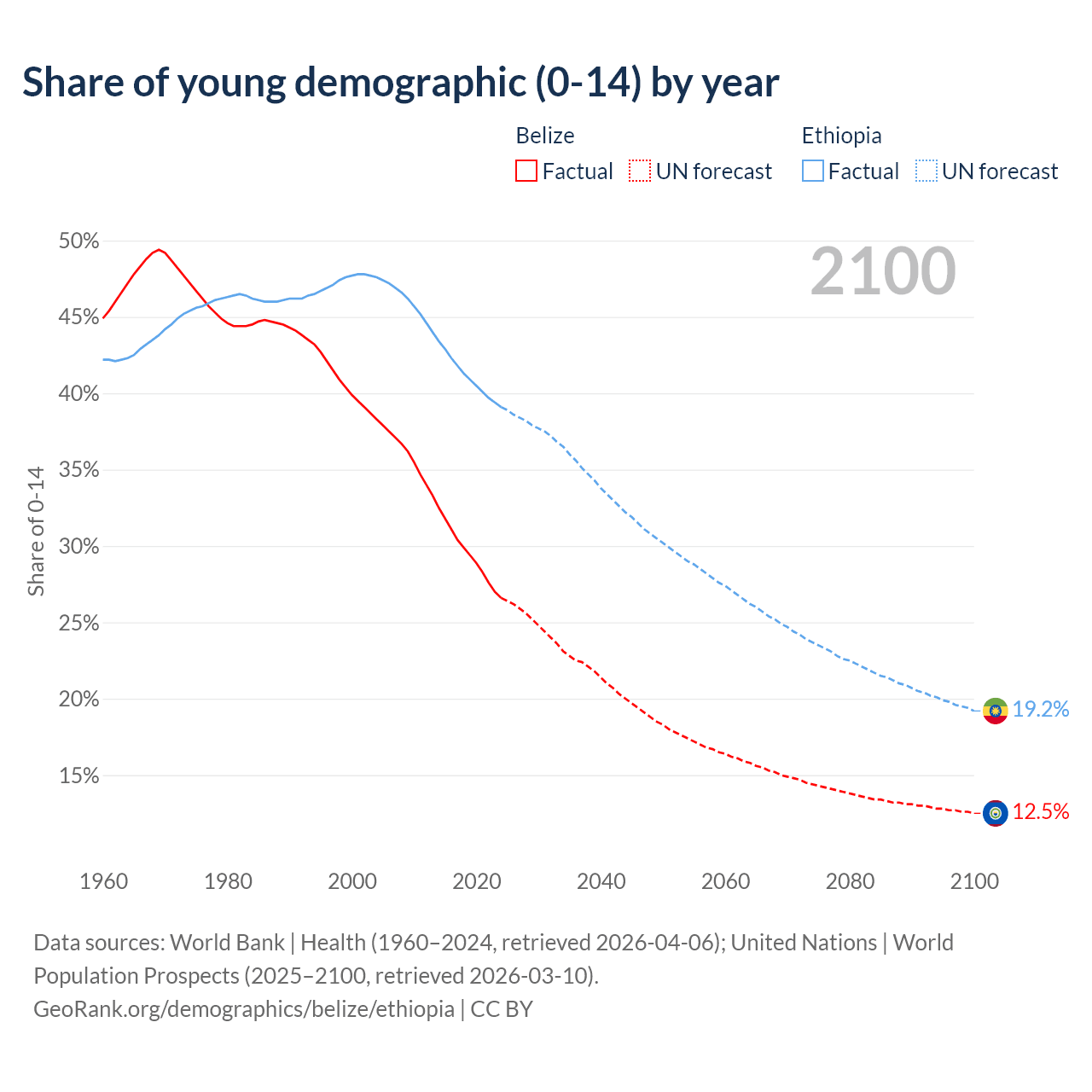 - The share of young demographic (0-15 years old) in Belize is 26.6% vs 39.1% in Ethiopia.
