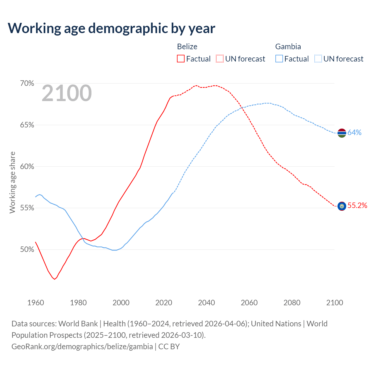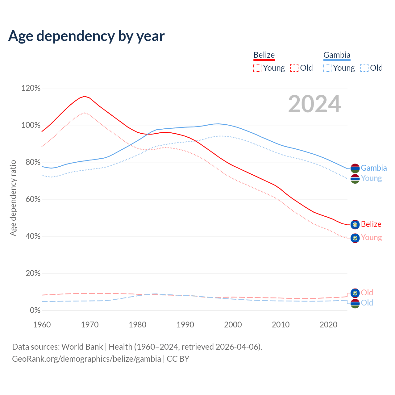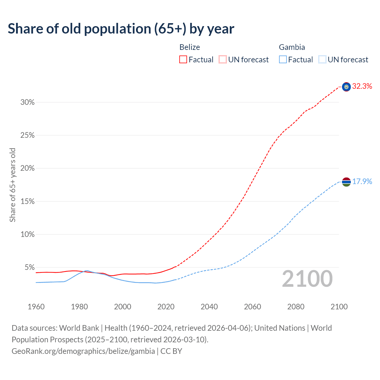 - The share of old-age demographic (65+) in Belize is 5.02% vs 3.08% in the Gambia.