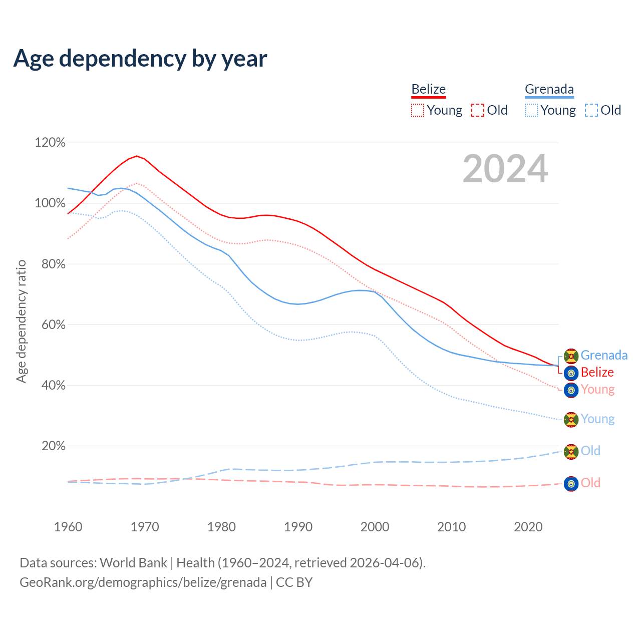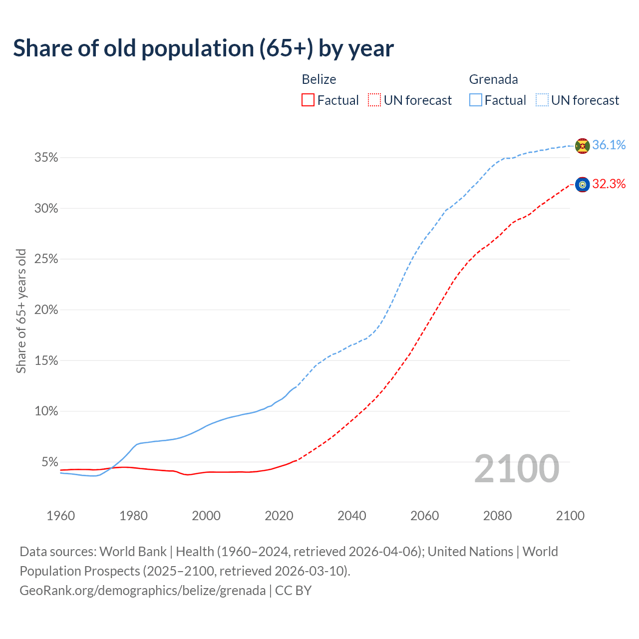 - The share of old-age demographic (65+) in Belize is 5.02% vs 12.2% in Grenada.