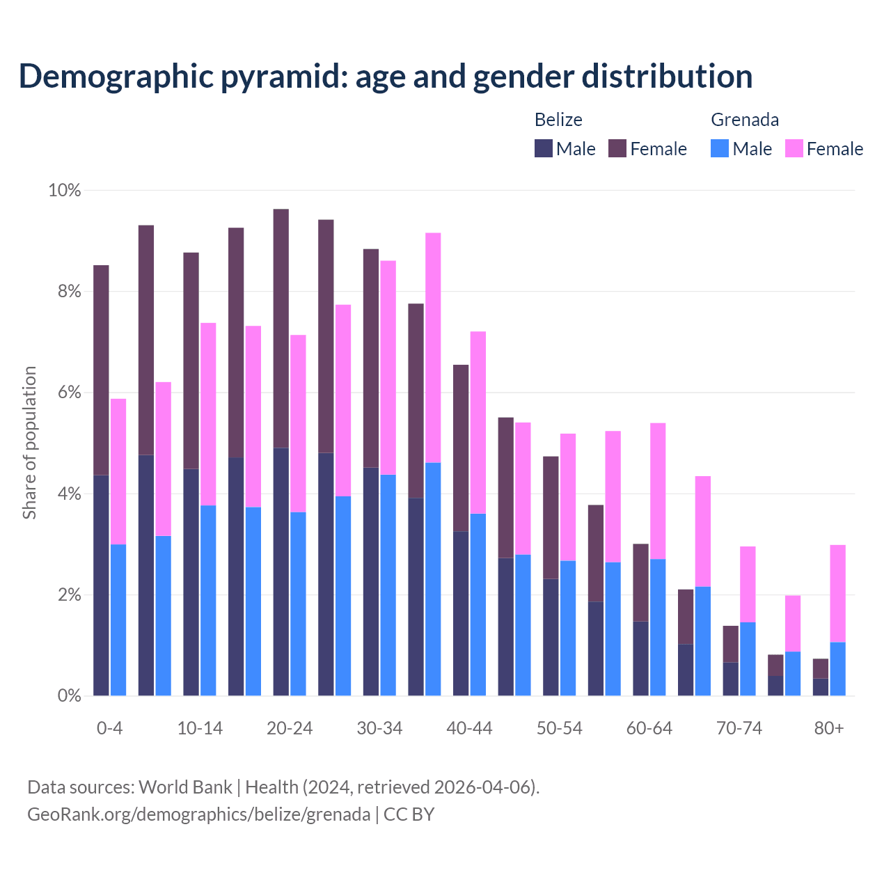 - The share of young demographic (0-15 years old) in Belize is 26.6% vs 19.4% in Grenada.