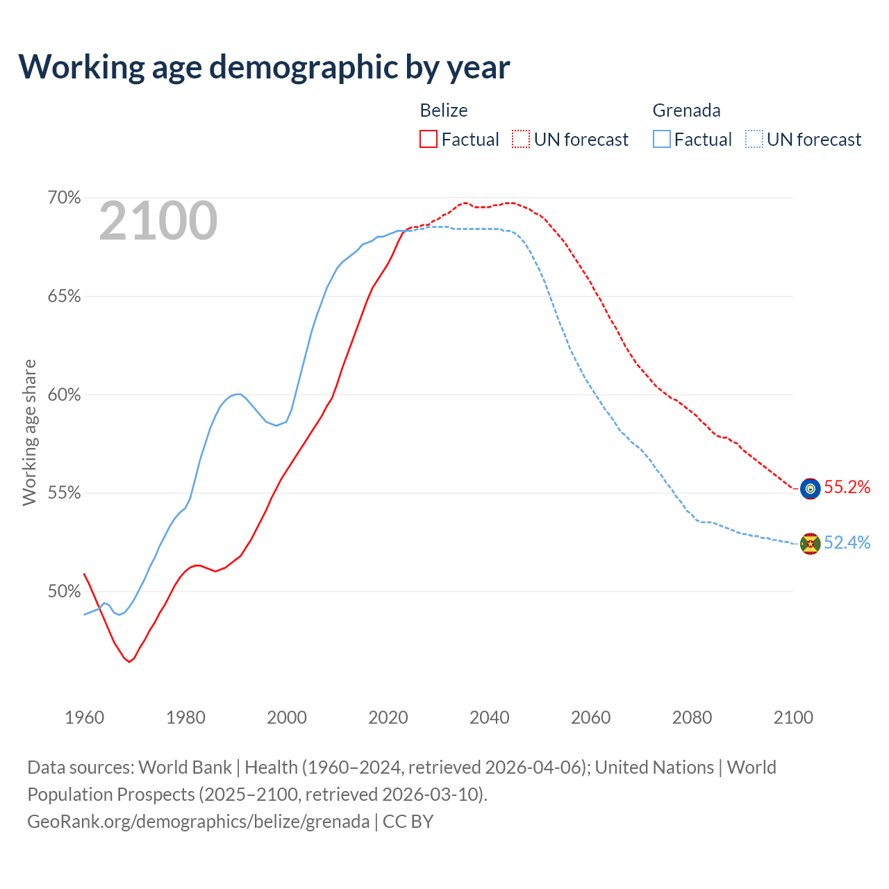 Median age Belize vs Grenada, 1960-2100
