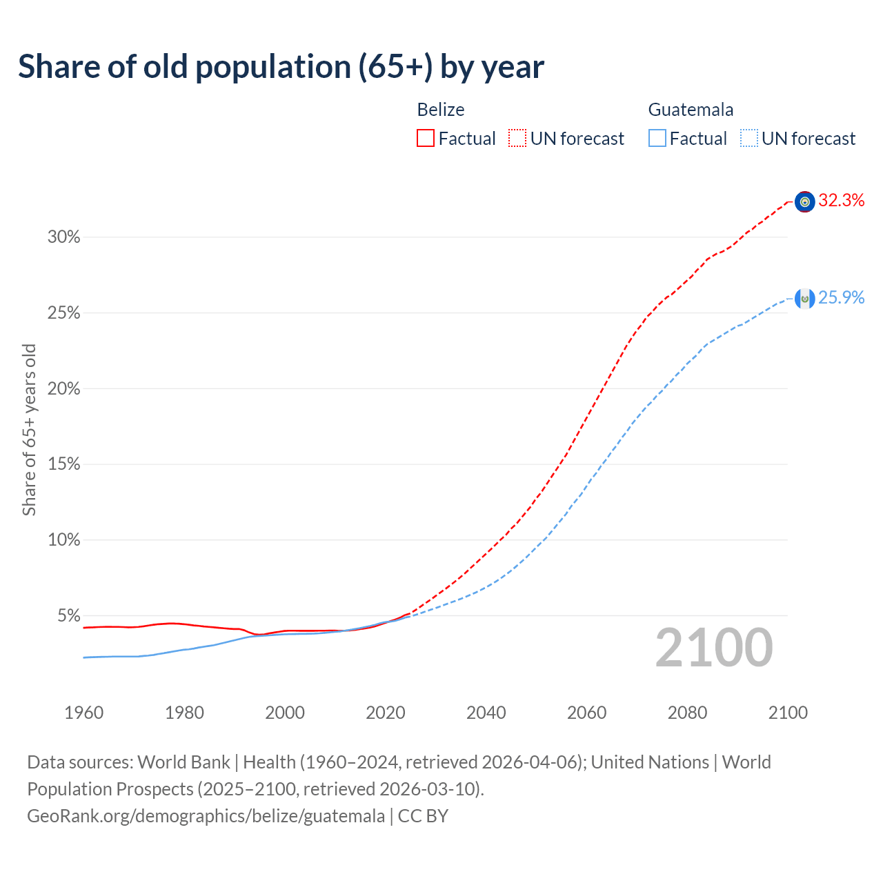 The share of older people aged 65 and over is 5.02% in Belize and 4.85% in Guatemala. Life expectancy in Belize compared to Guatemala .