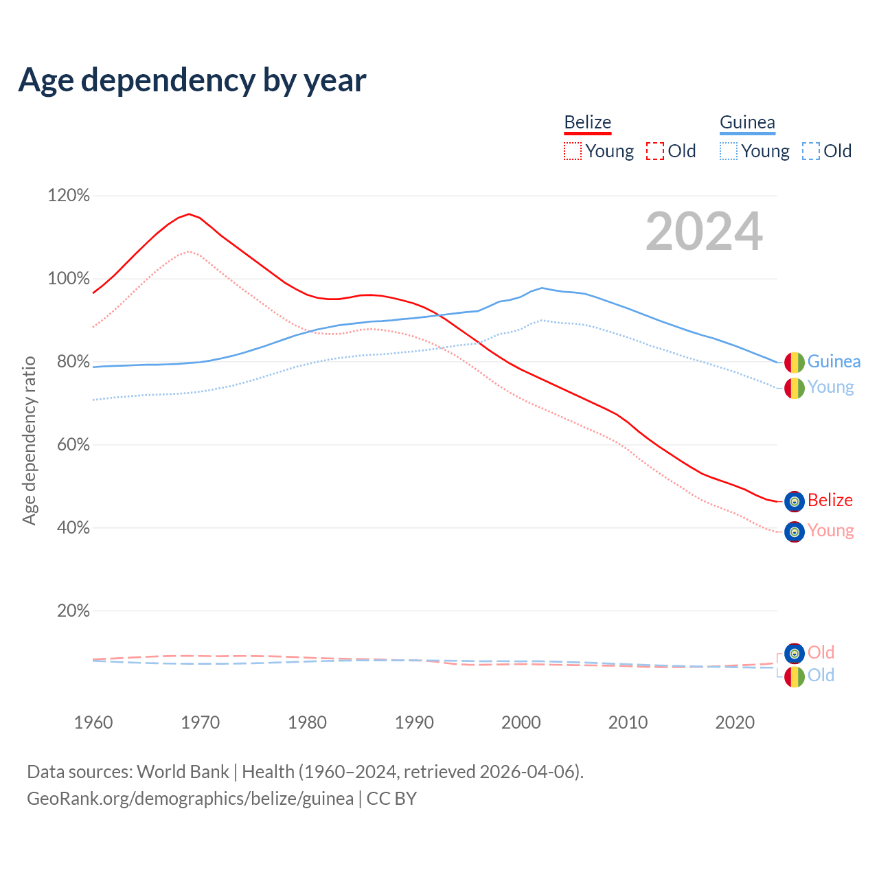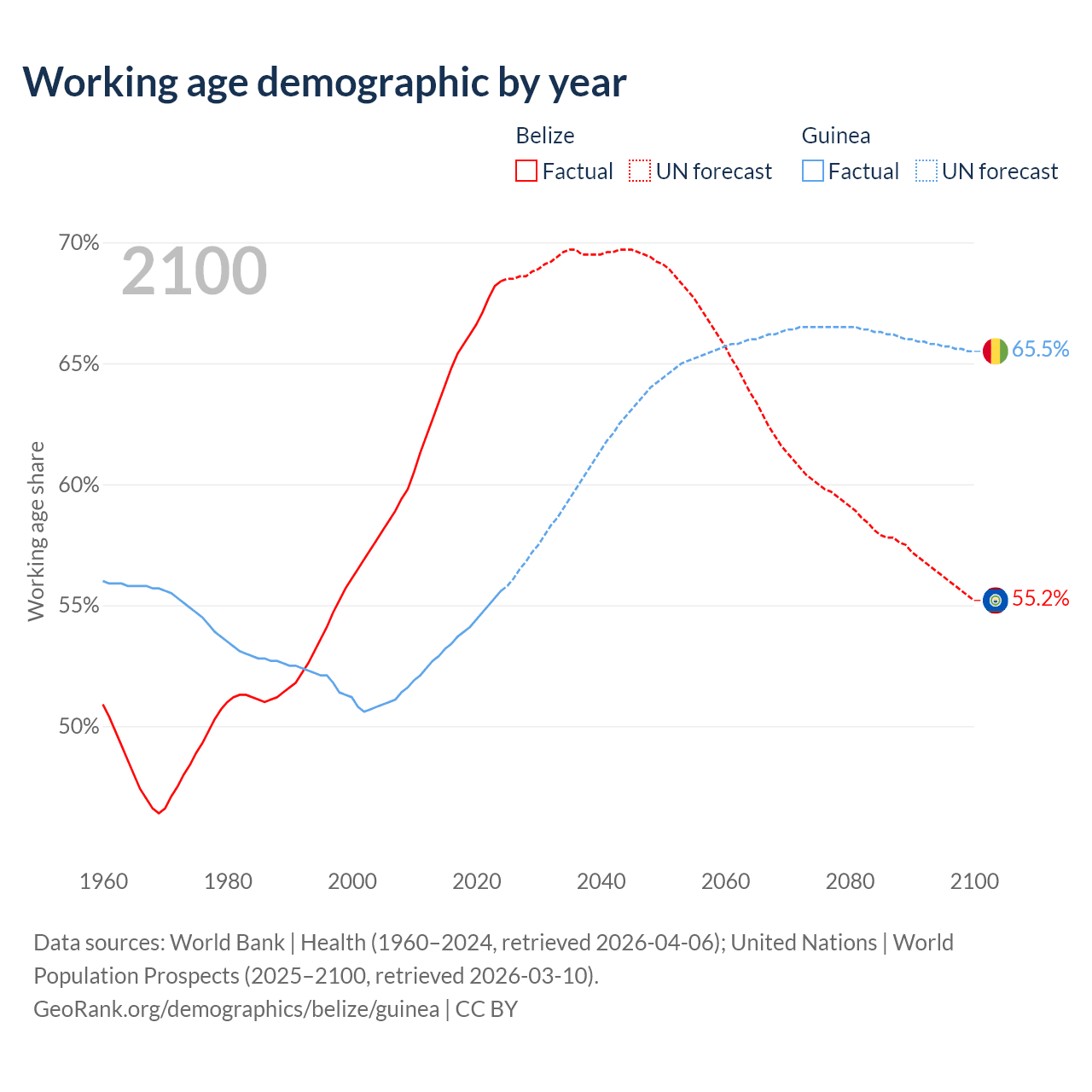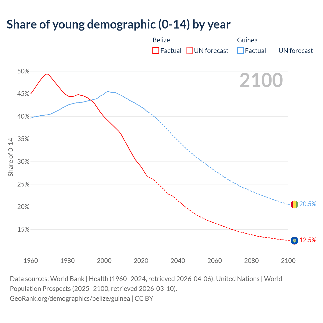 - The share of young demographic (0-15 years old) in Belize is 26.6% vs 40.9% in Guinea.