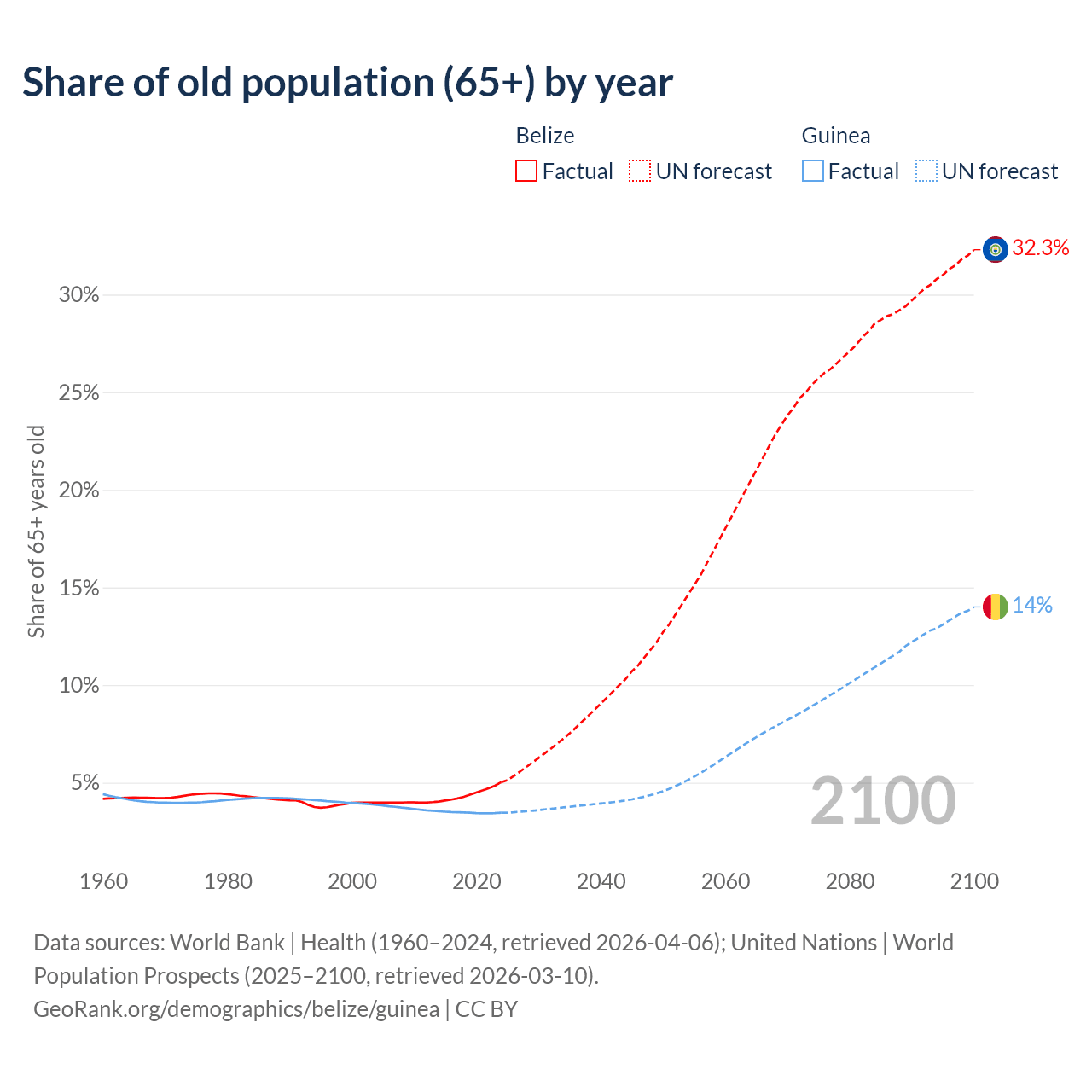 - The share of old-age demographic (65+) in Belize is 5.02% vs 3.46% in Guinea.