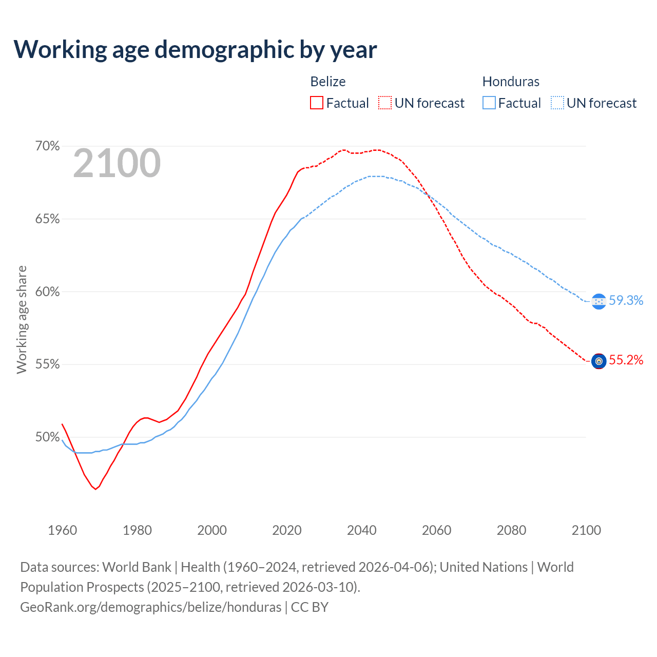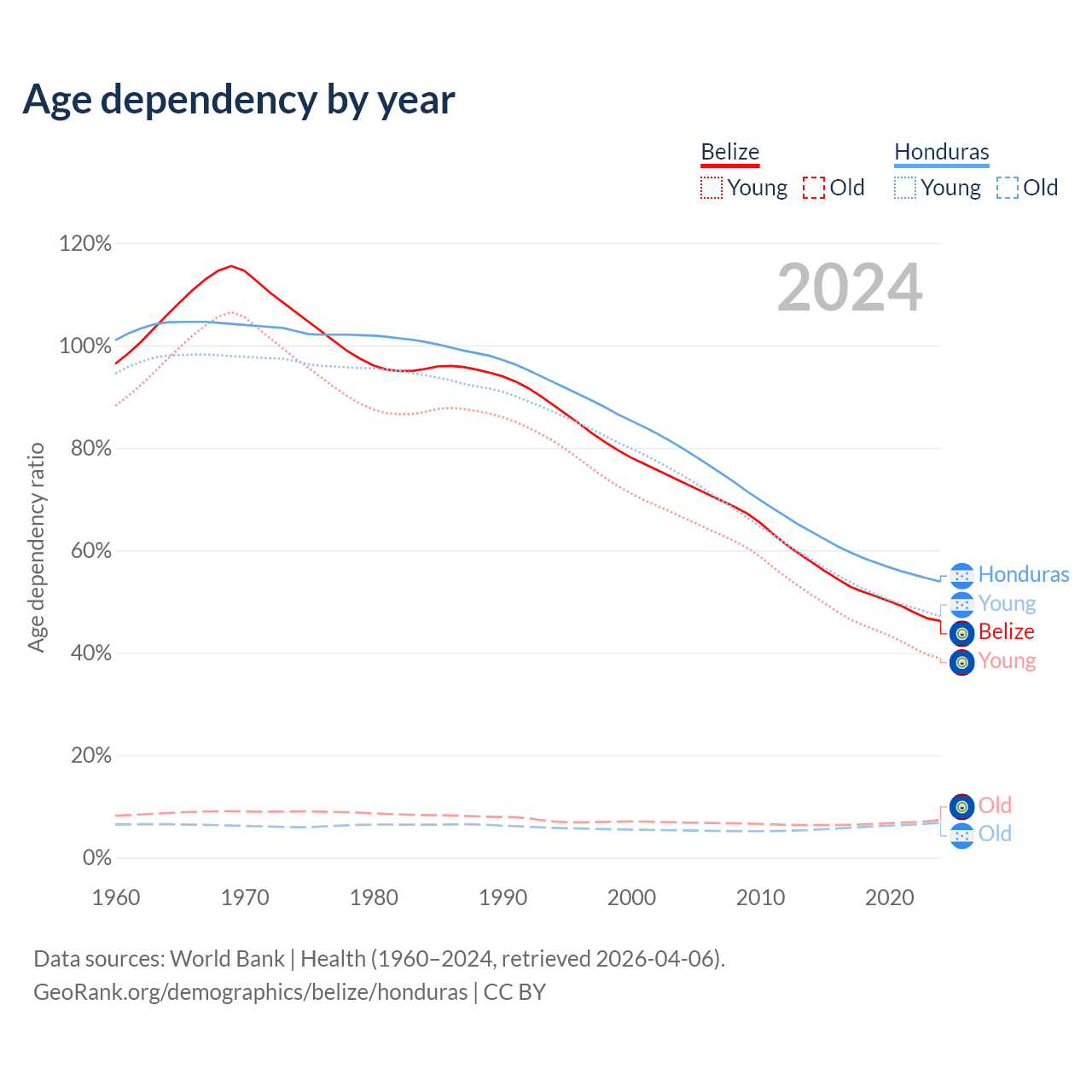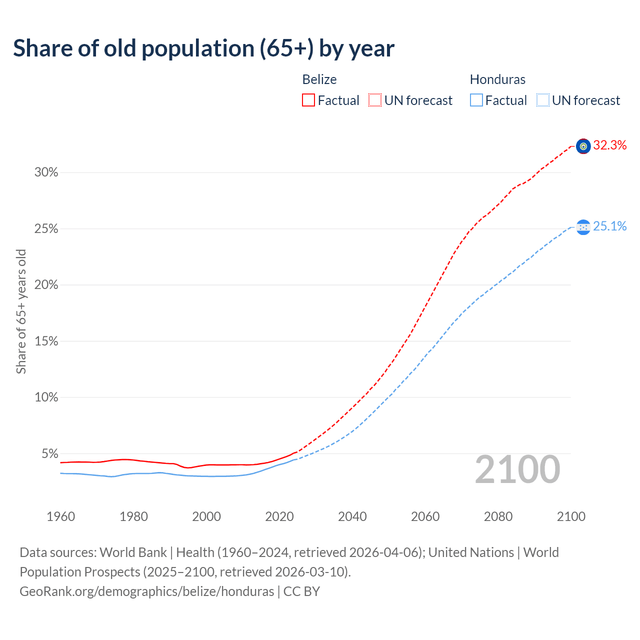 - The share of old-age demographic (65+) in Belize is 5.02% vs 4.42% in Honduras.