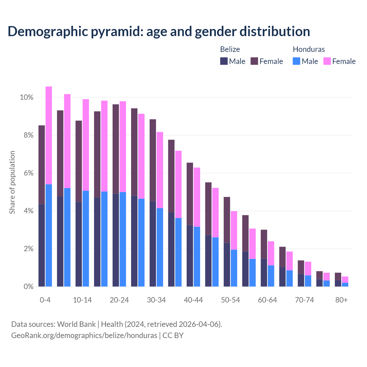 - Belize is ranked 120/196 by median age (oldest to youngest) vs 134/196 for Honduras.