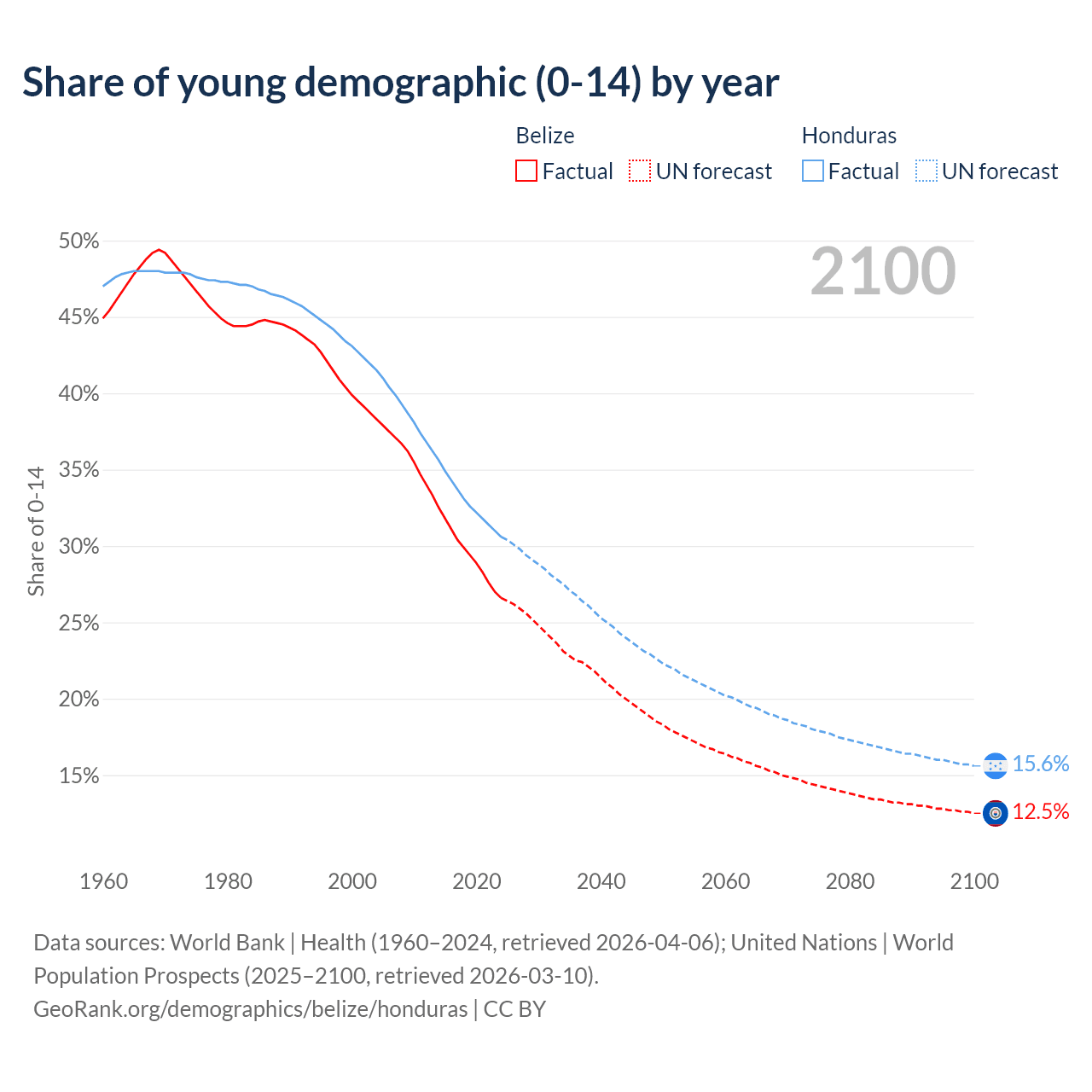 - The share of young demographic (0-15 years old) in Belize is 26.6% vs 30.6% in Honduras.