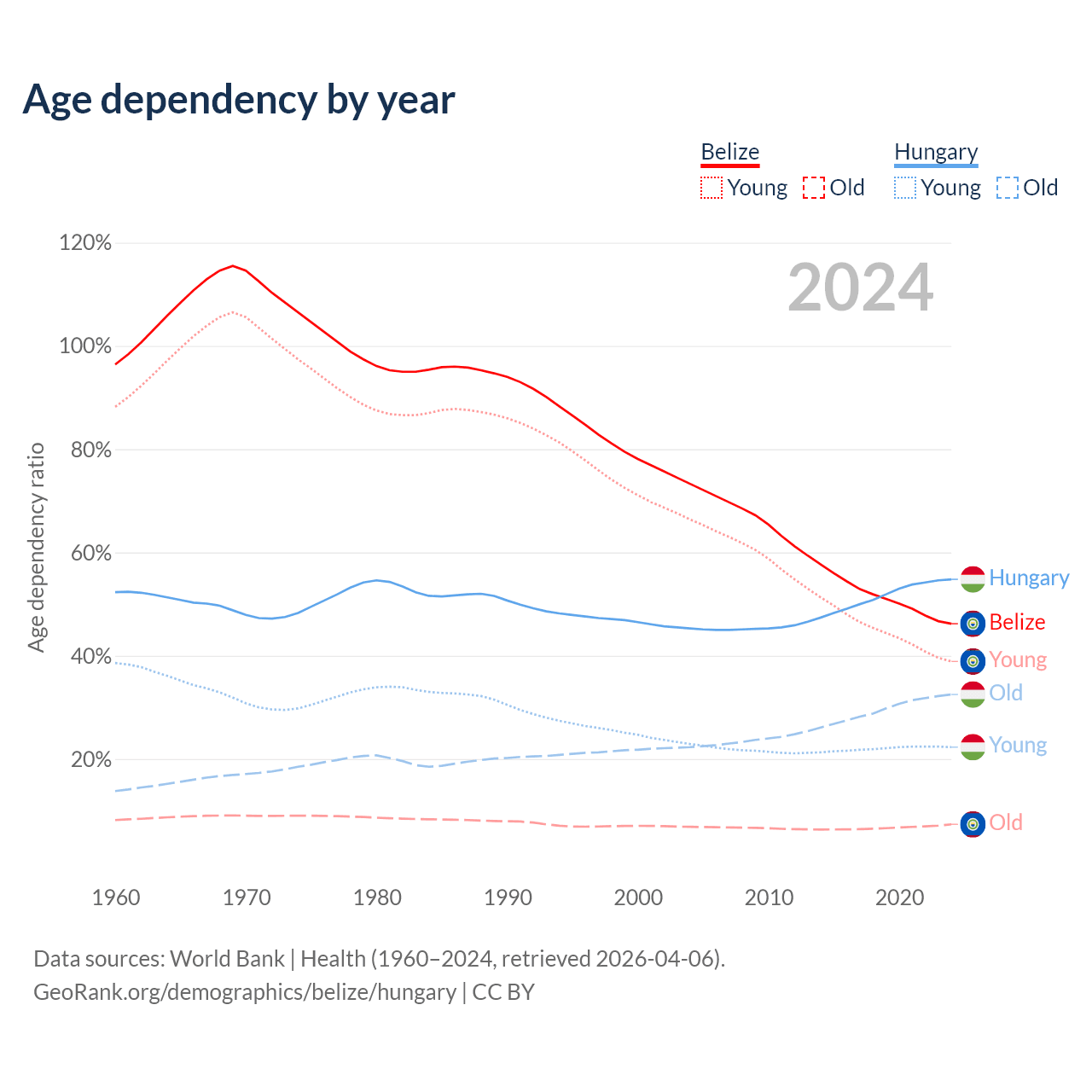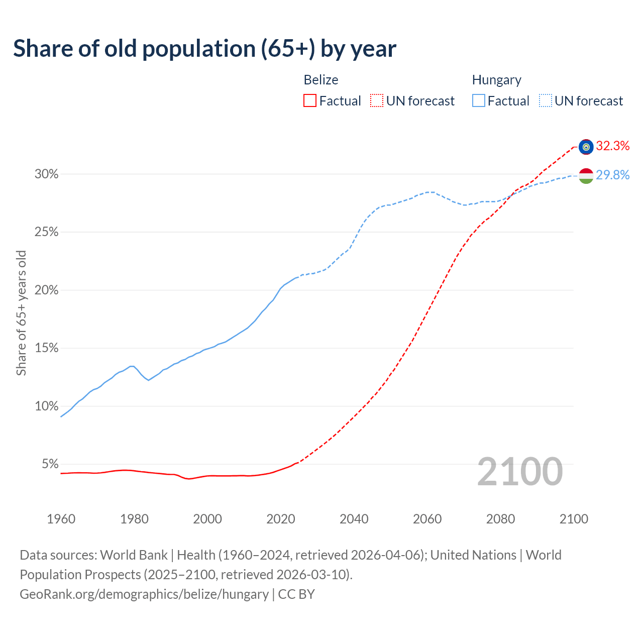 - The share of old-age demographic (65+) in Belize is 5.02% vs 21% in Hungary.