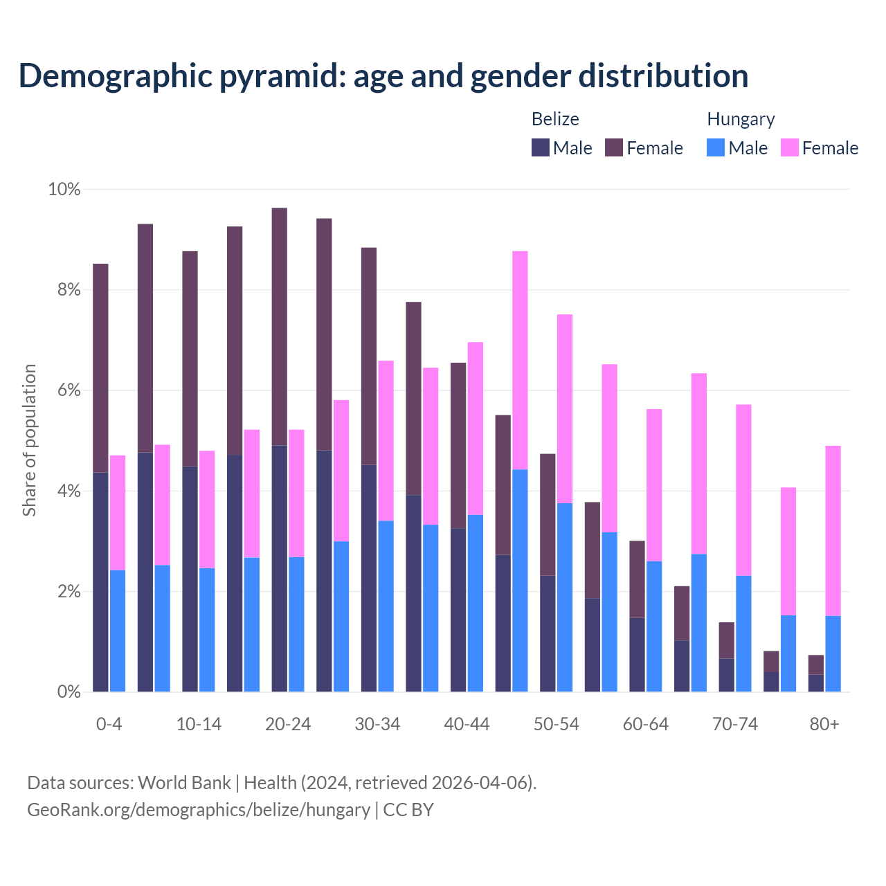 - Belize is ranked 120/196 by median age (oldest to youngest) vs 17/196 for Hungary.