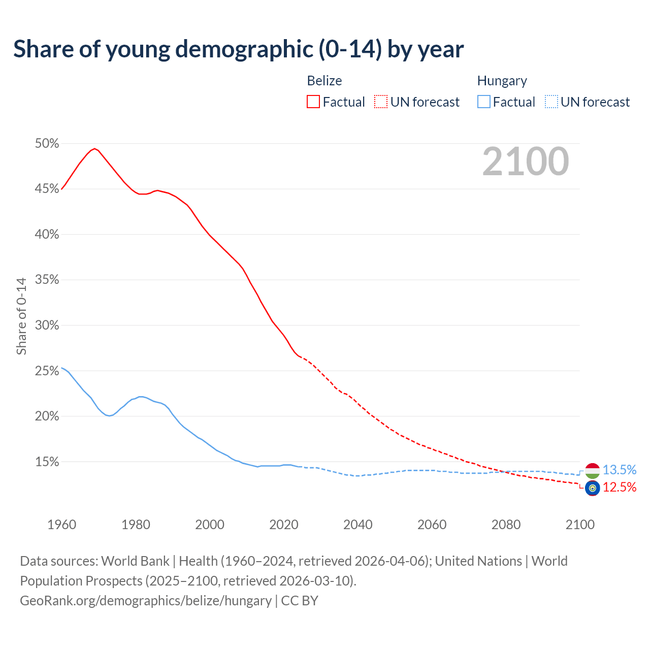 - The share of young demographic (0-15 years old) in Belize is 26.6% vs 14.4% in Hungary.