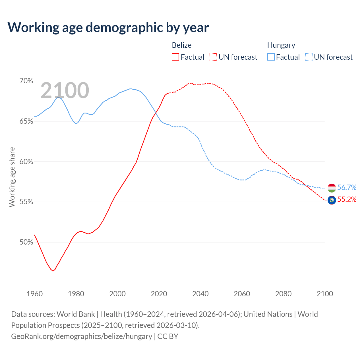 - Belize has 294K working age adults (aged 15-64) vs 6.12M in Hungary.