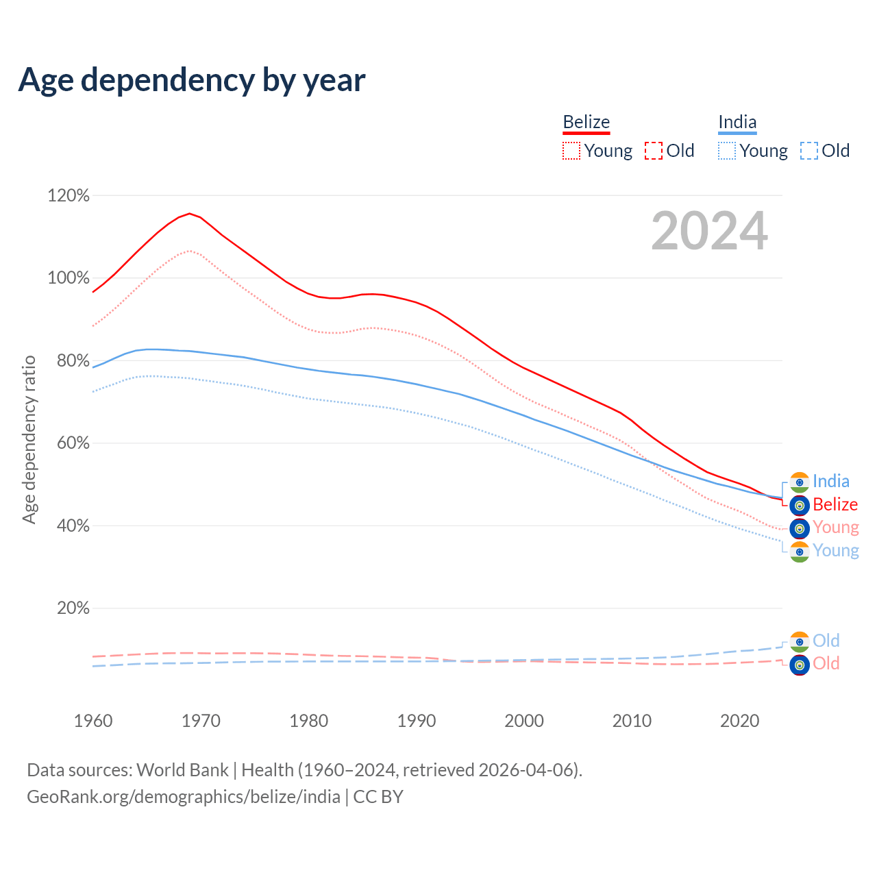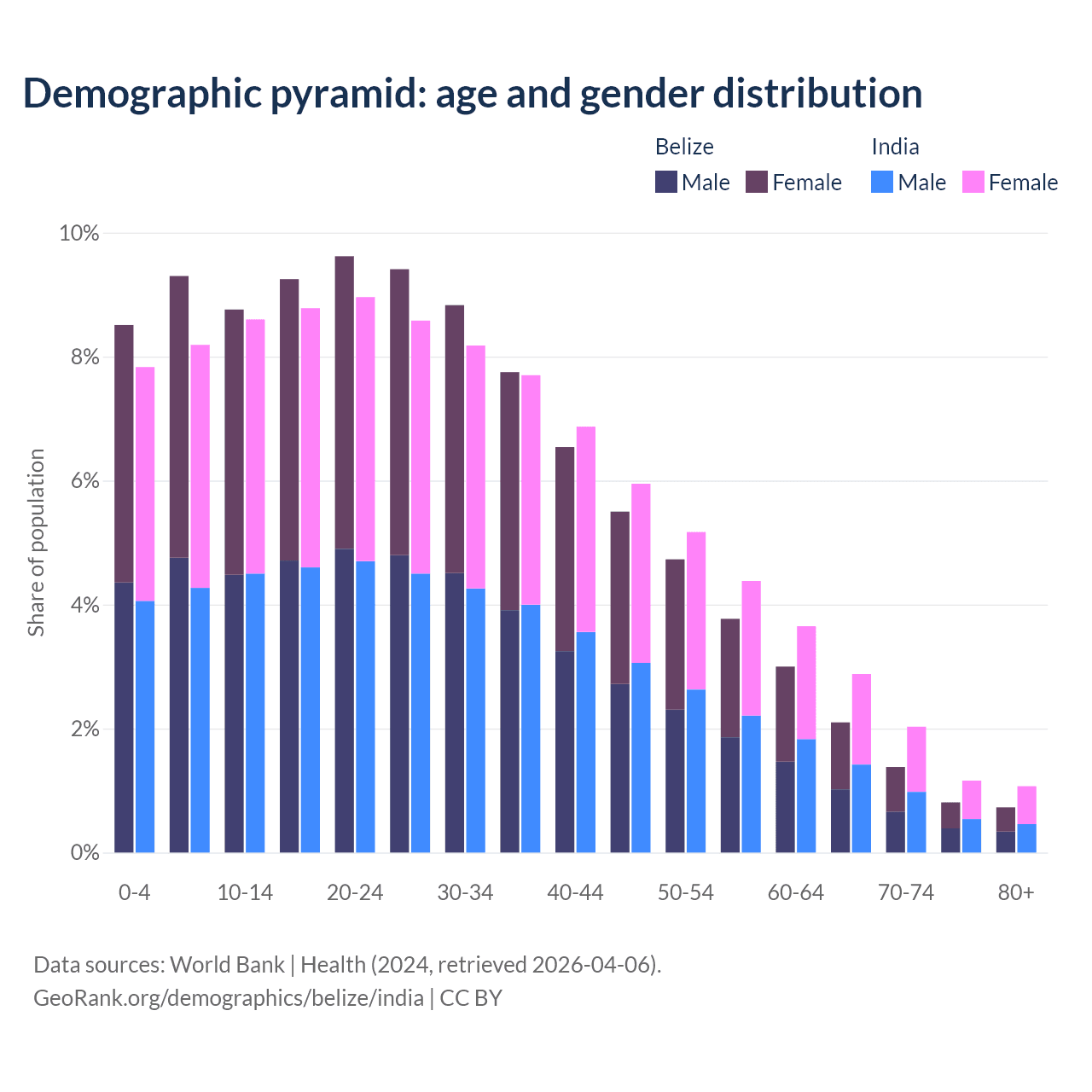 - Belize is ranked 120/196 by median age (oldest to youngest) vs 108/196 for India.