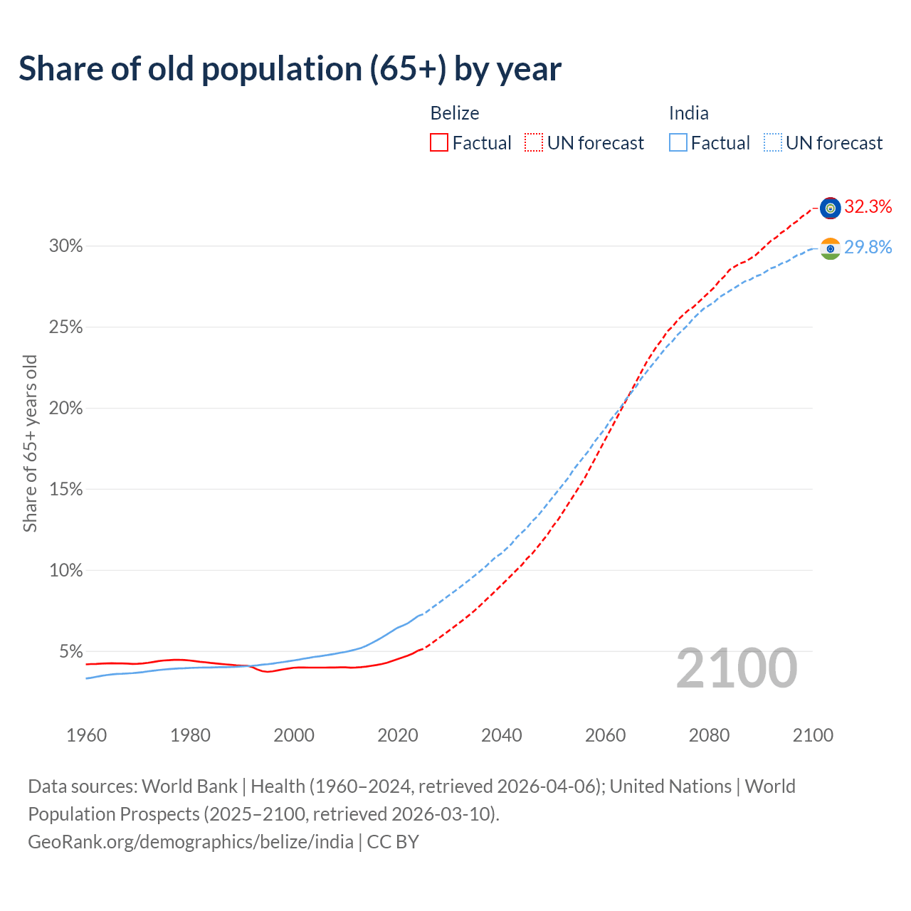- The share of old-age demographic (65+) in Belize is 5.02% vs 7.15% in India.