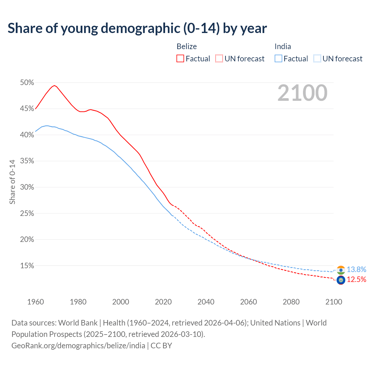 - The share of young demographic (0-15 years old) in Belize is 26.6% vs 24.6% in India.