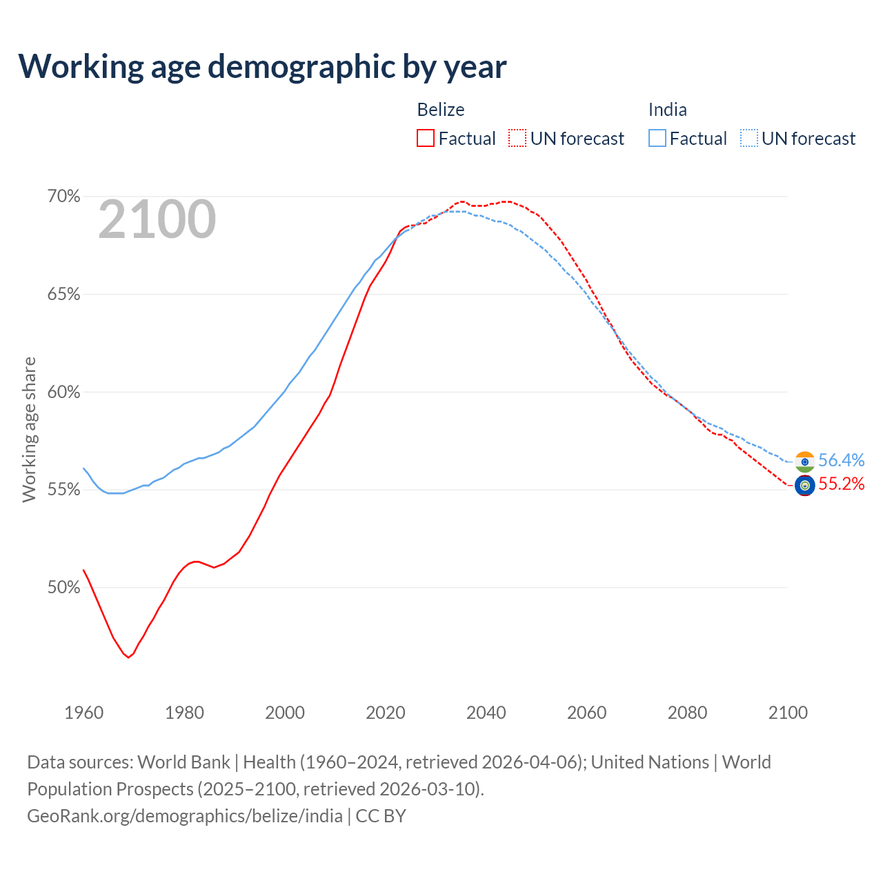 - Belize has 294K working age adults (aged 15-64) vs 1.01B in India.