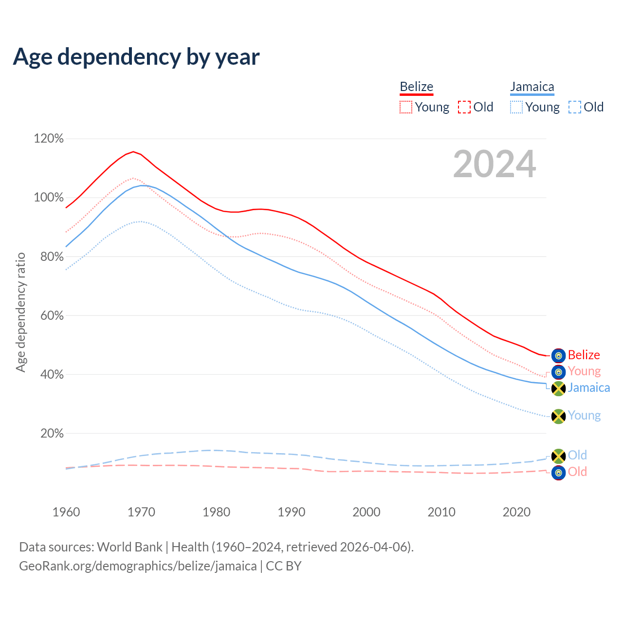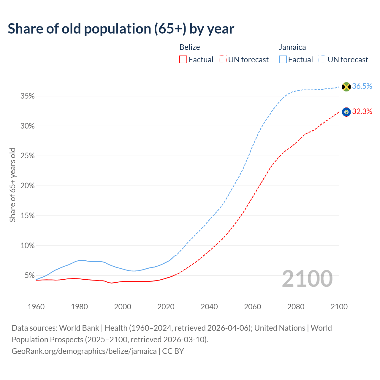 The share of older people aged 65 and over is 5.02% in Belize and 8.21% in Jamaica. Life expectancy in Belize compared to Jamaica .