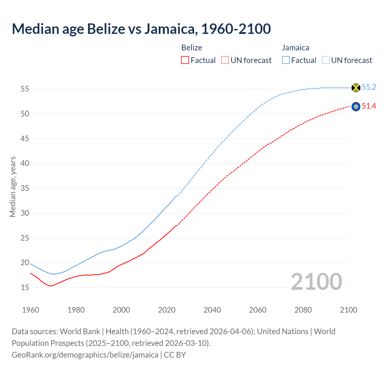 - The median age in Belize is 27.4 years compared to 33.3 years in Jamaica.