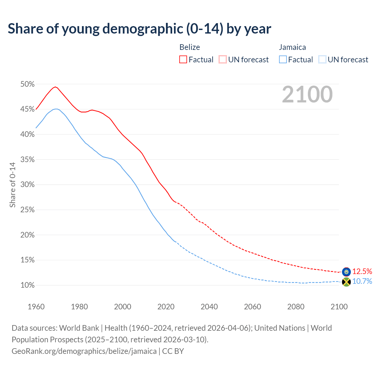- The share of young demographic (0-15 years old) in Belize is 26.6% vs 18.7% in Jamaica.