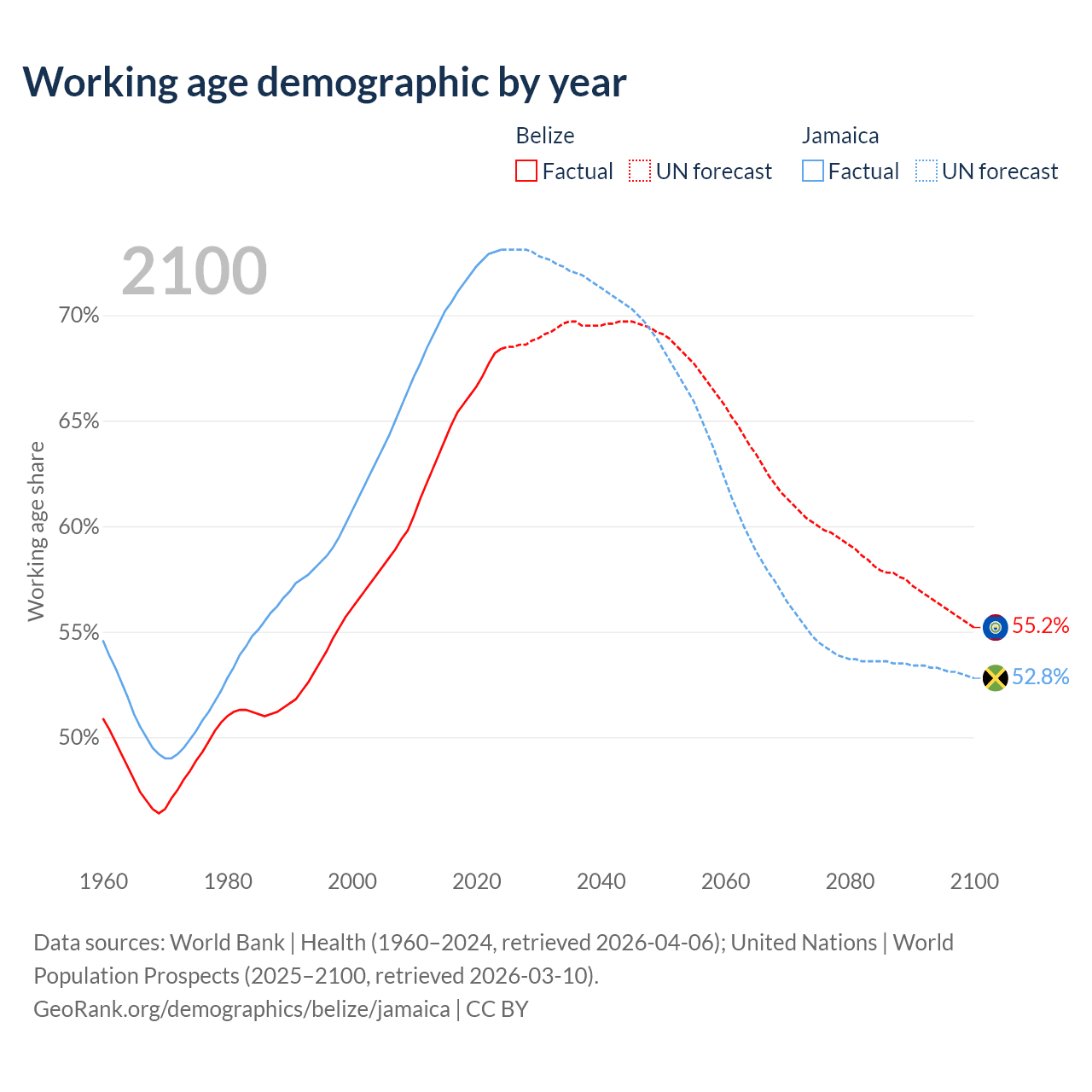 - Belize has 294K working age adults (aged 15-64) vs 2.07M in Jamaica.