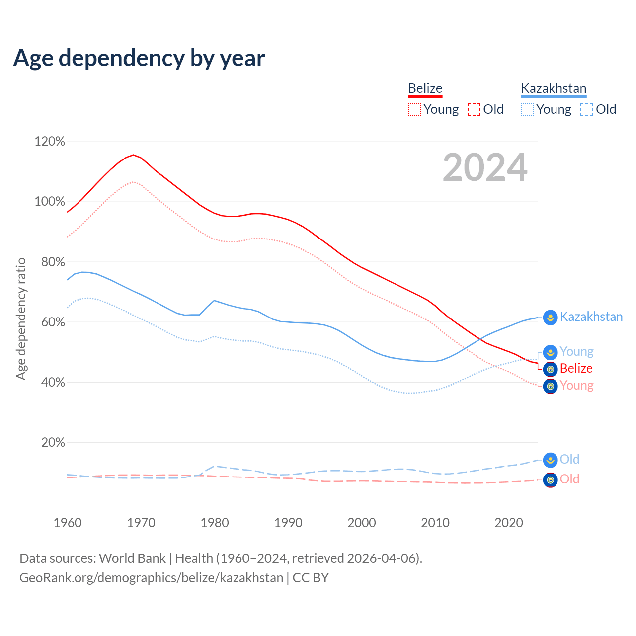 Data sources: World Bank | Health (1960–2024, retrieved 2026-04-06); U.S. Census Bureau (1960–2024, retrieved 2026-02-08).