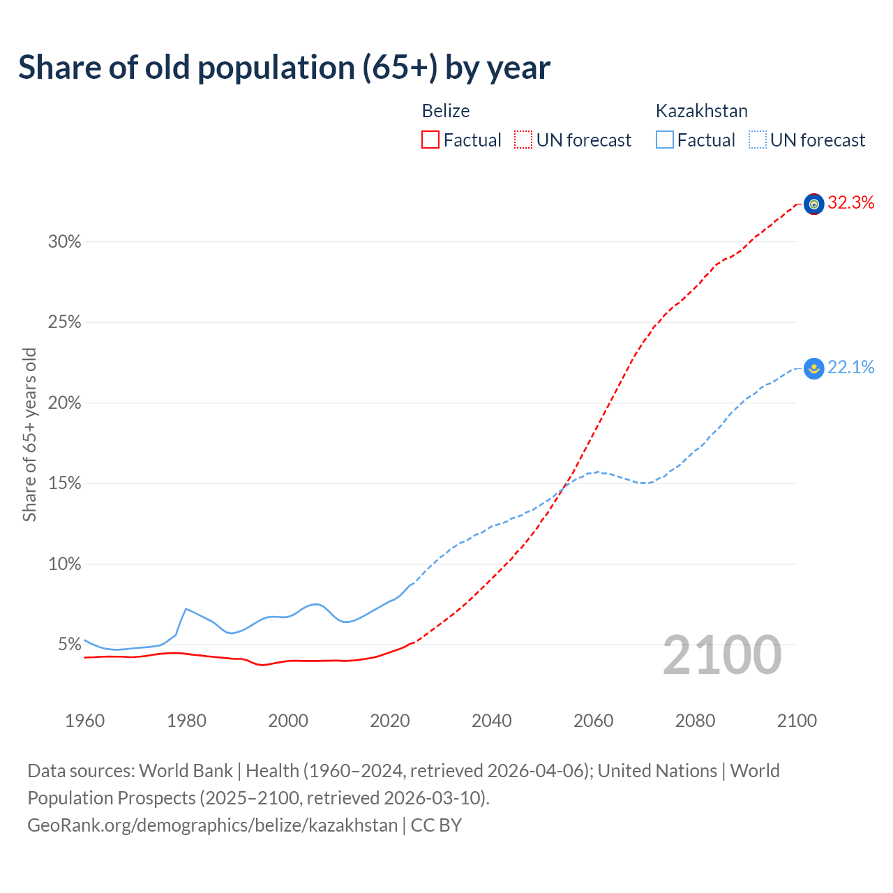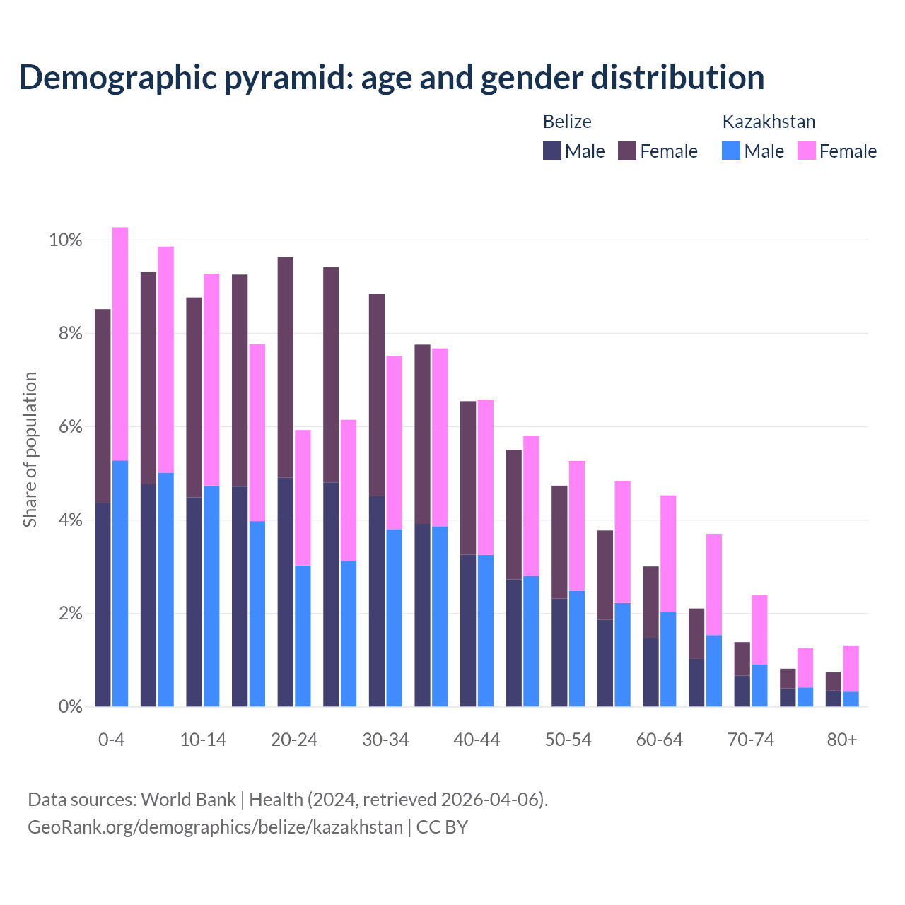 - The share of old-age demographic (65+) in Belize is 5.02% vs 8.65% in Kazakhstan.