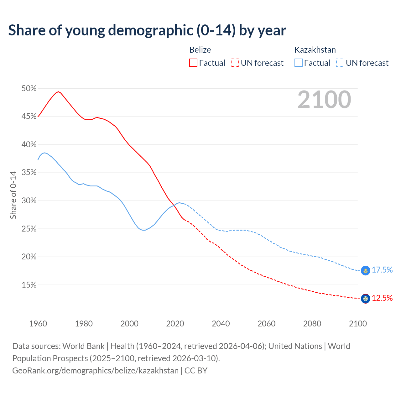 - The share of young demographic (0-15 years old) in Belize is 26.6% vs 29.4% in Kazakhstan.