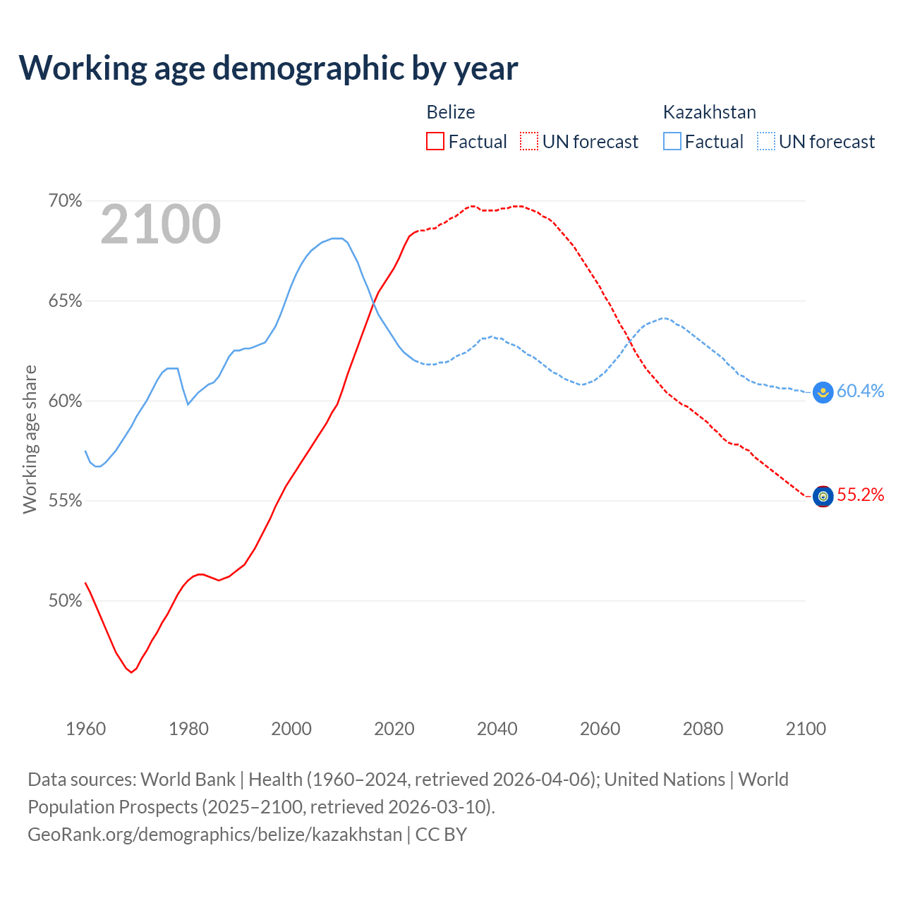 Median age Belize vs Kazakhstan, 1960-2100