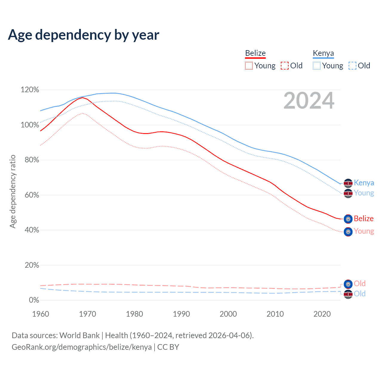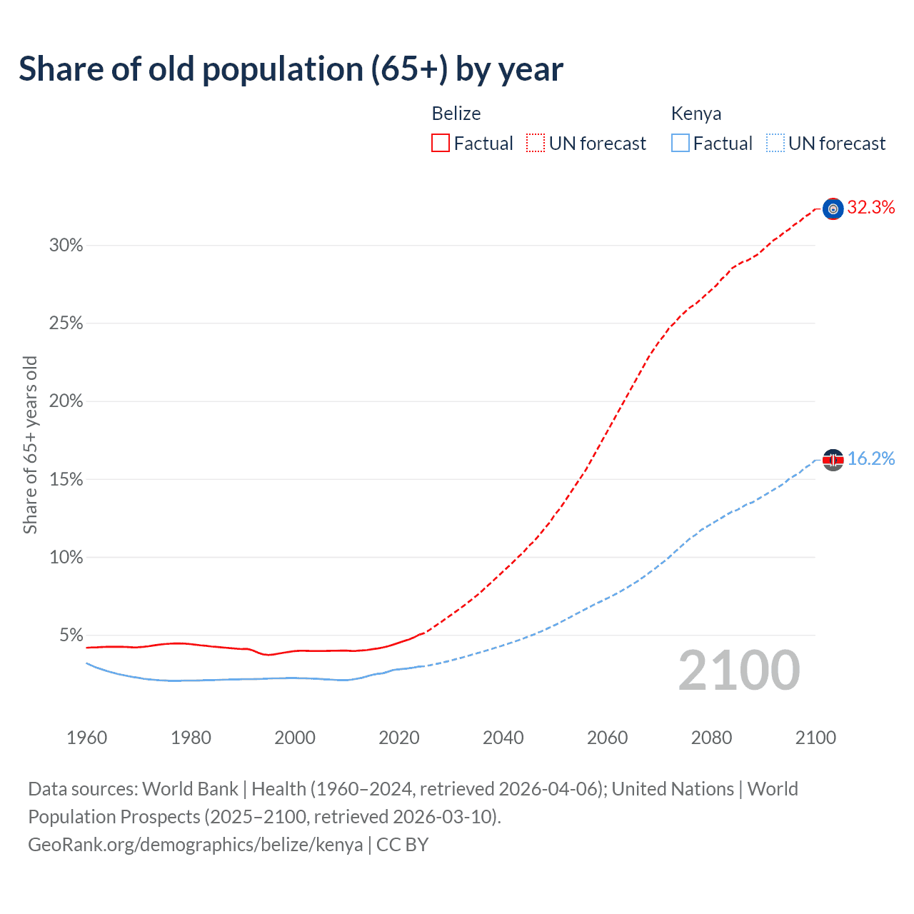 - The share of old-age demographic (65+) in Belize is 5.02% vs 2.97% in Kenya.