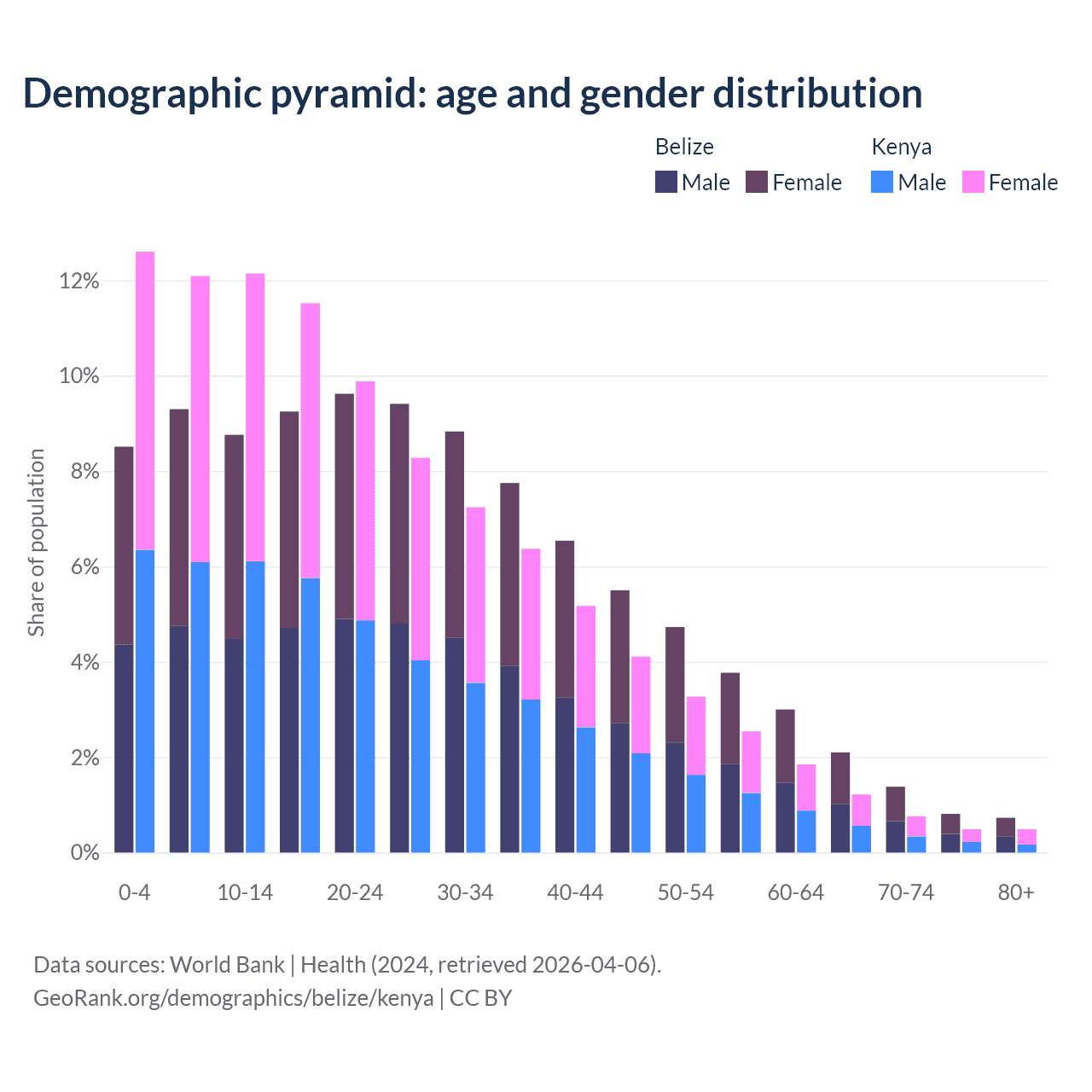 - The median age in Belize is 27.4 years compared to 20.8 years in Kenya.