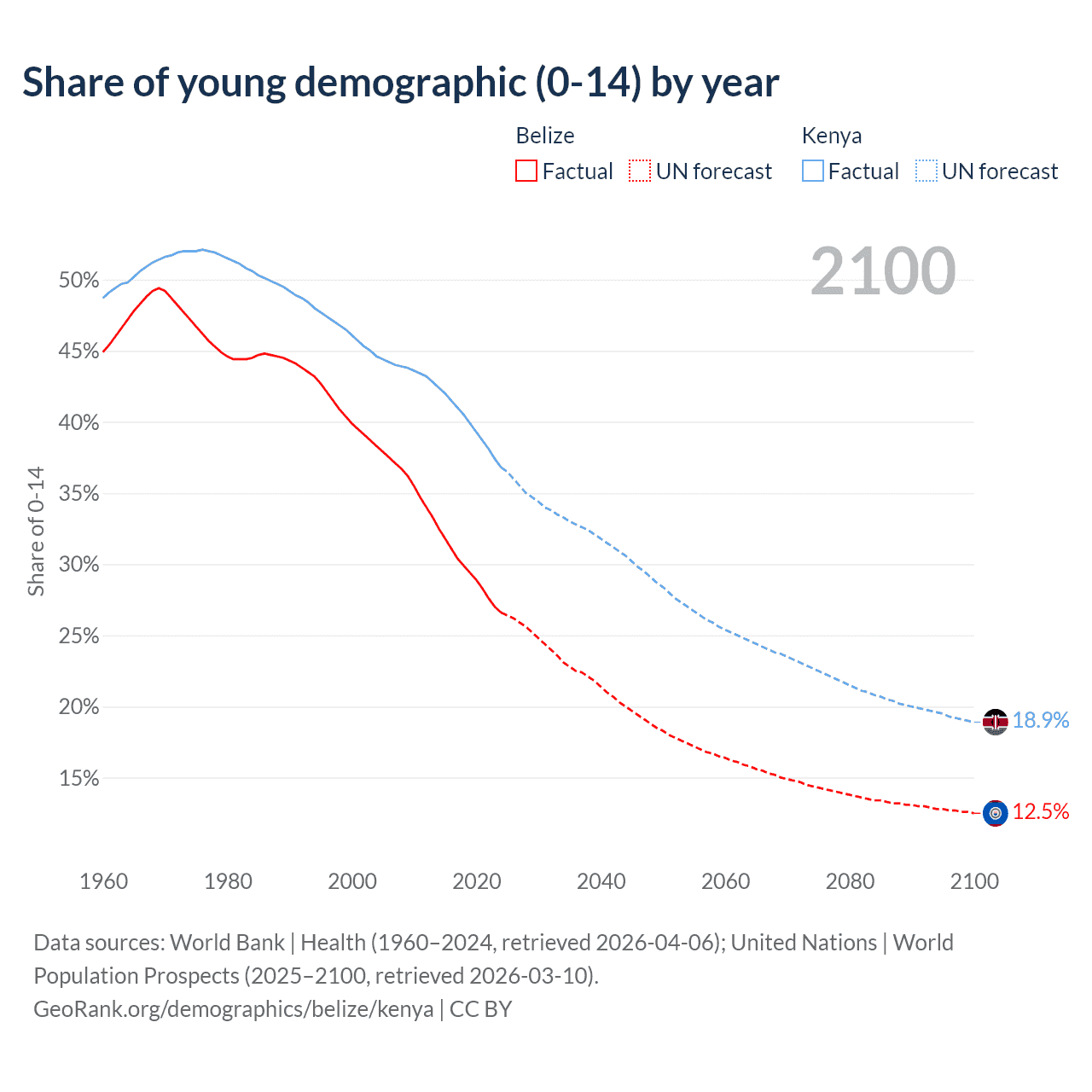 - The share of young demographic (0-15 years old) in Belize is 26.6% vs 36.8% in Kenya.