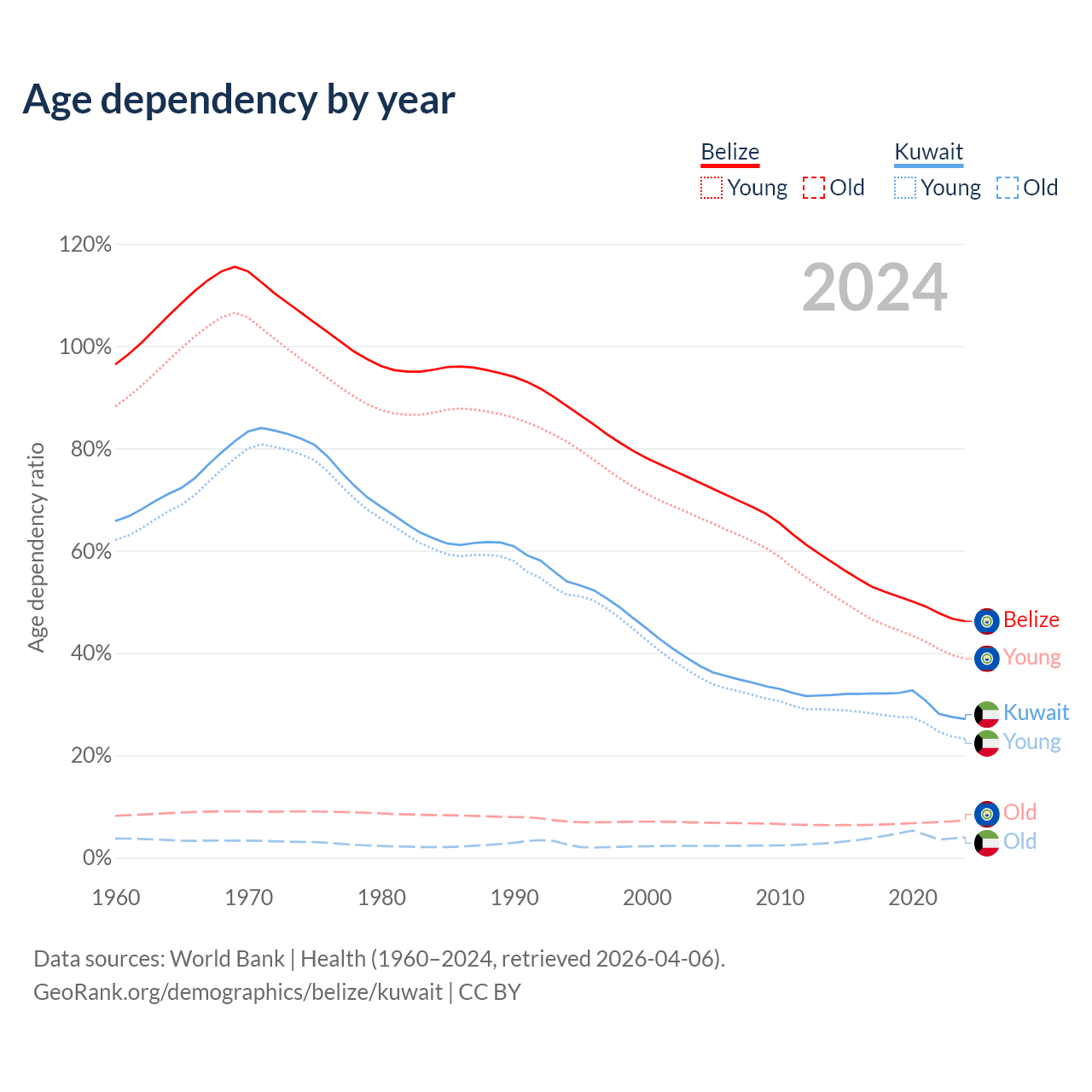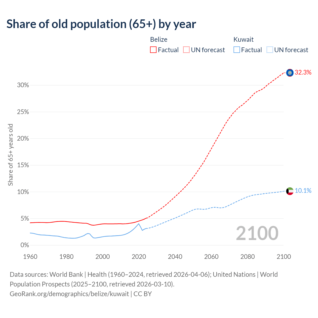 - The share of old-age demographic (65+) in Belize is 5.02% vs 3.1% in Kuwait.