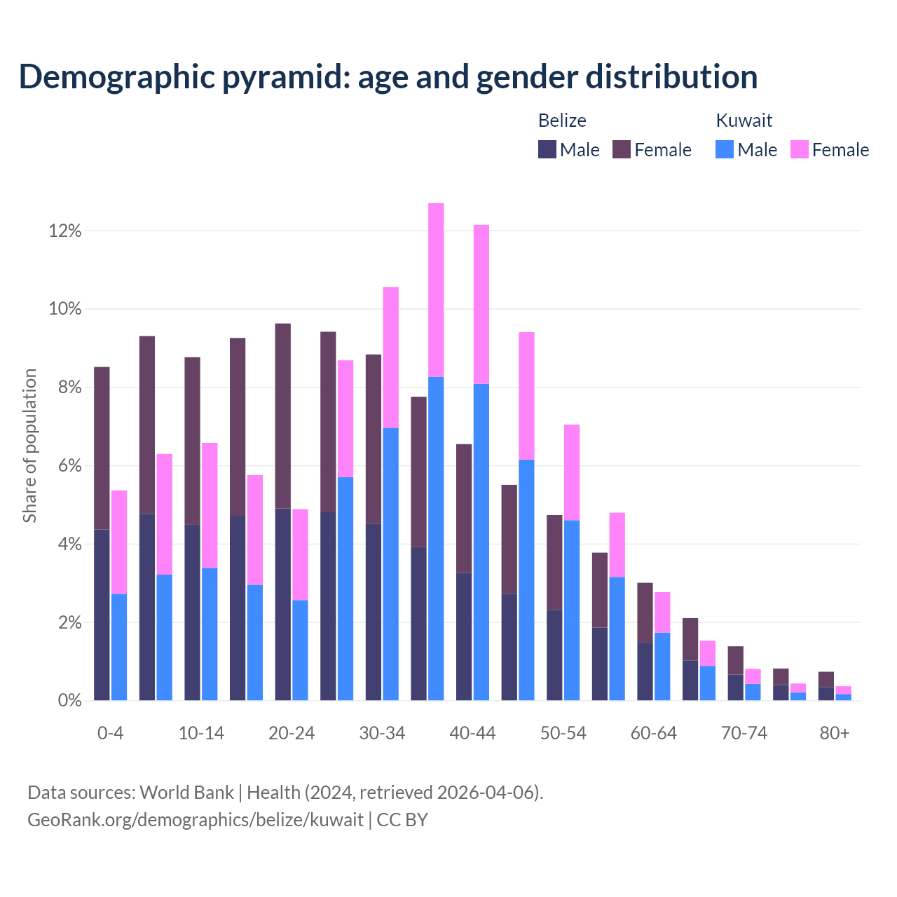 - As of 2026, the population of Belize is 430K vs 5.1M in Kuwait - 11.8 times difference.