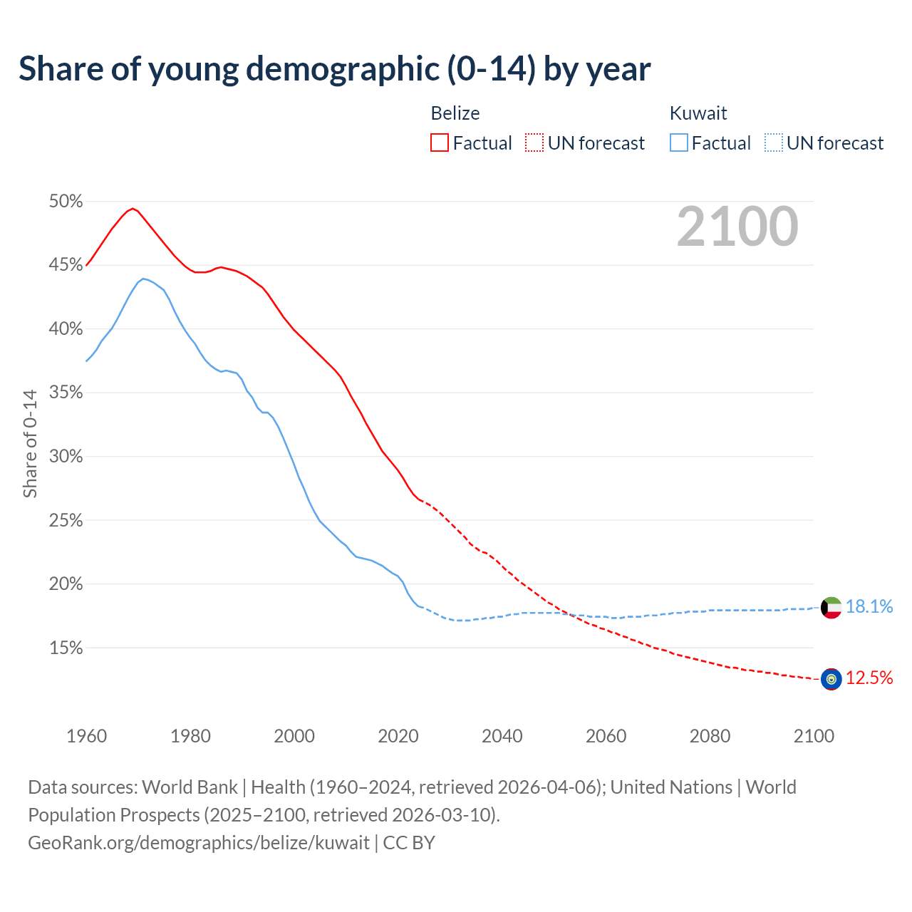 - The share of young demographic (0-15 years old) in Belize is 26.6% vs 18.2% in Kuwait.