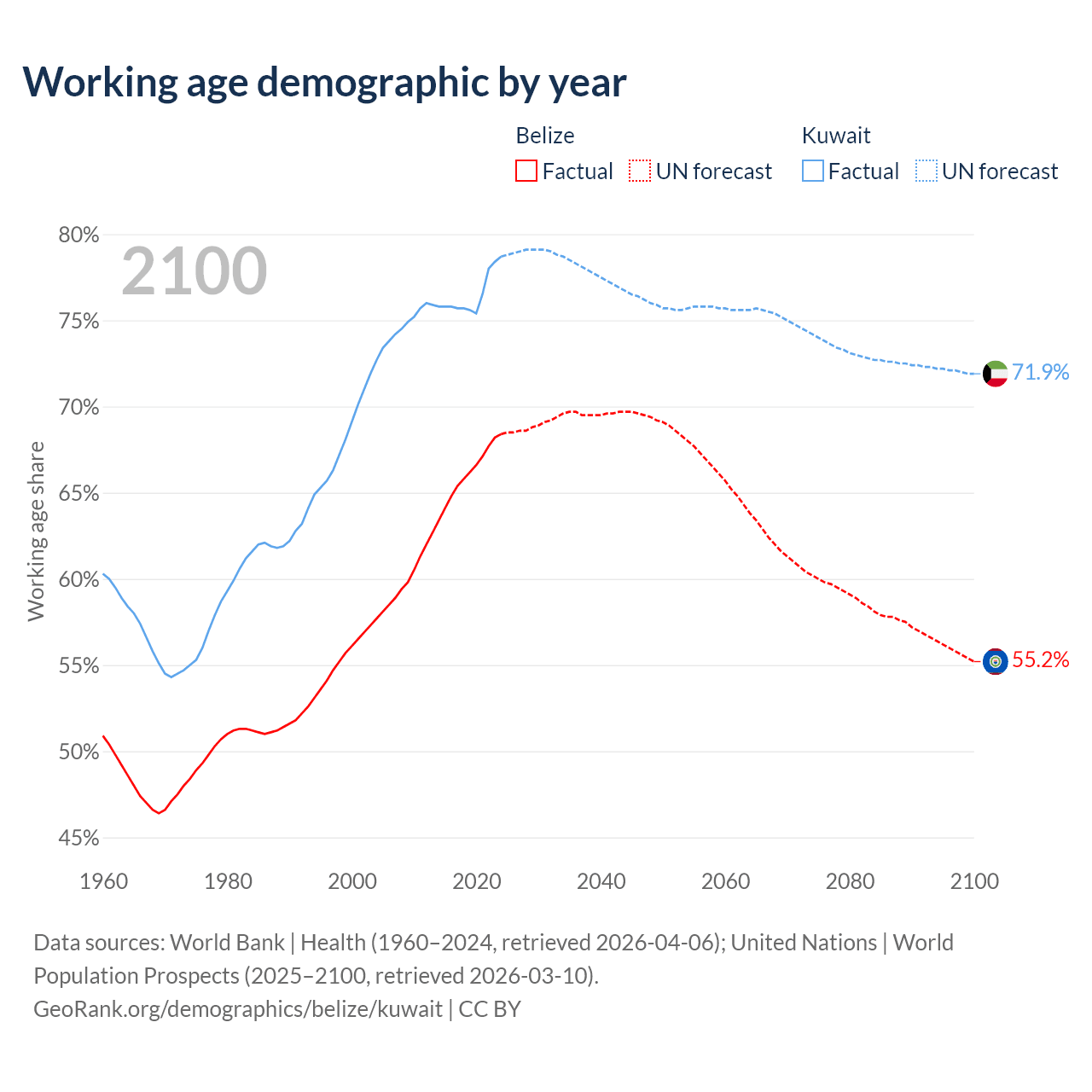 - Belize has 294K working age adults (aged 15-64) vs 4.01M in Kuwait.
