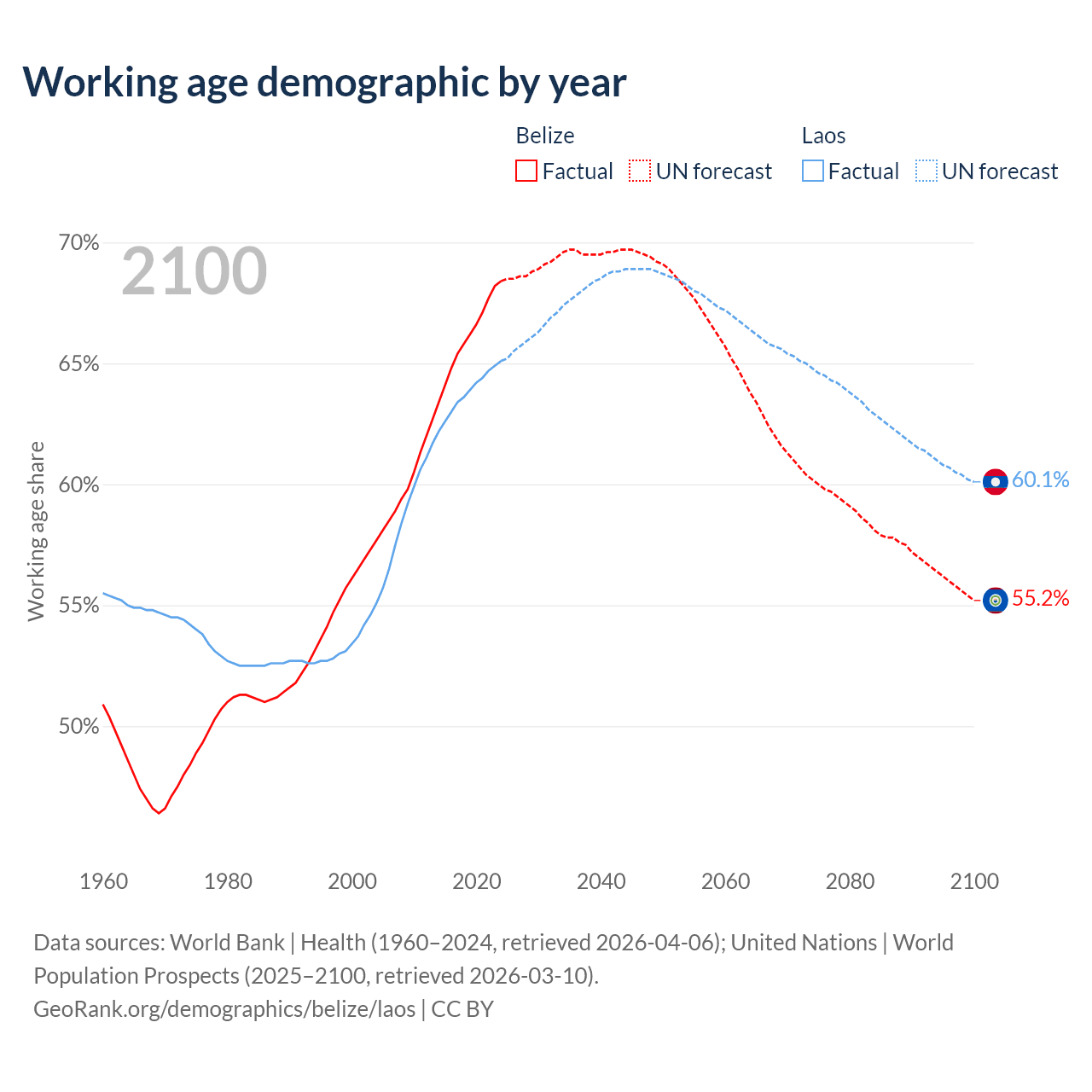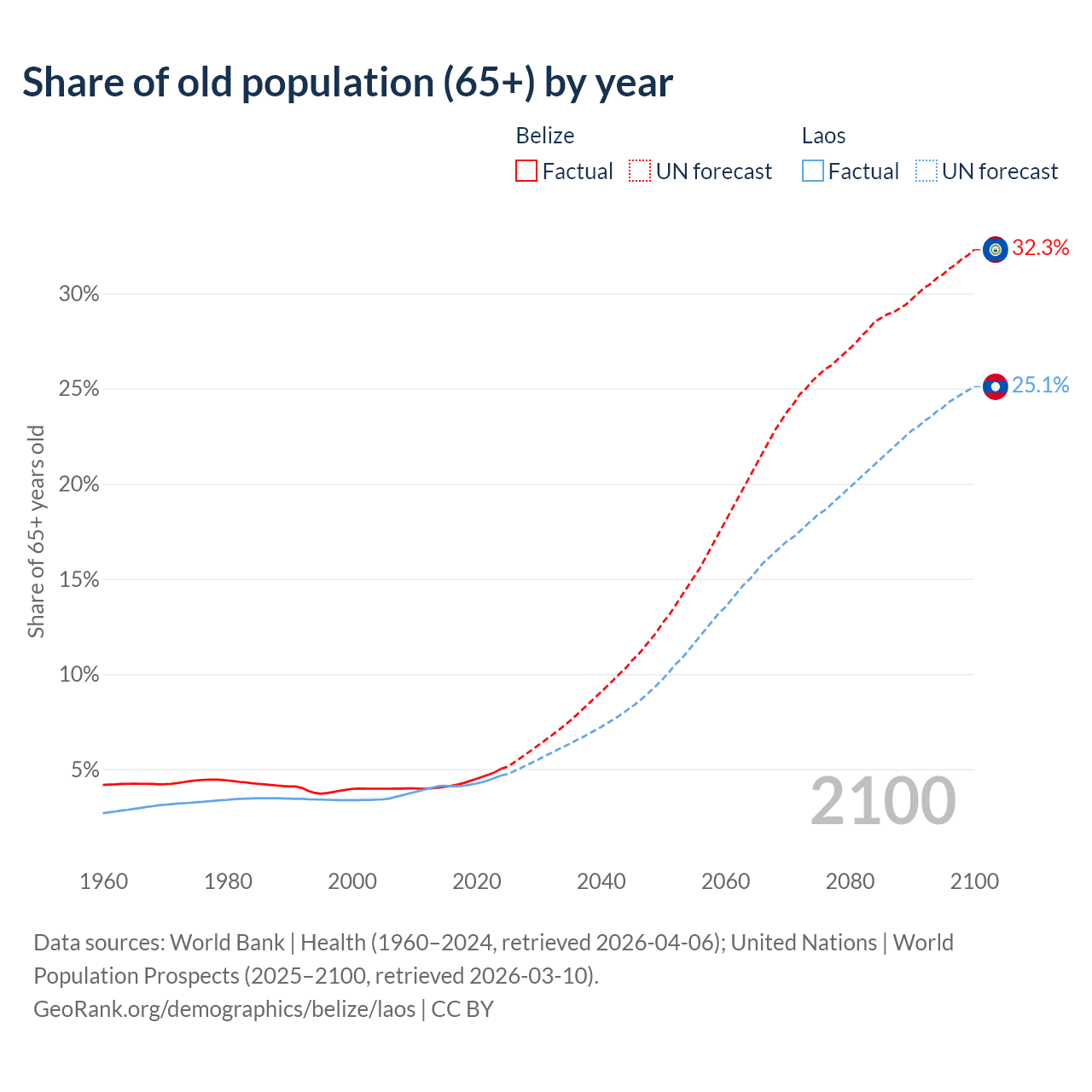 - The share of old-age demographic (65+) in Belize is 5.02% vs 4.67% in Laos.