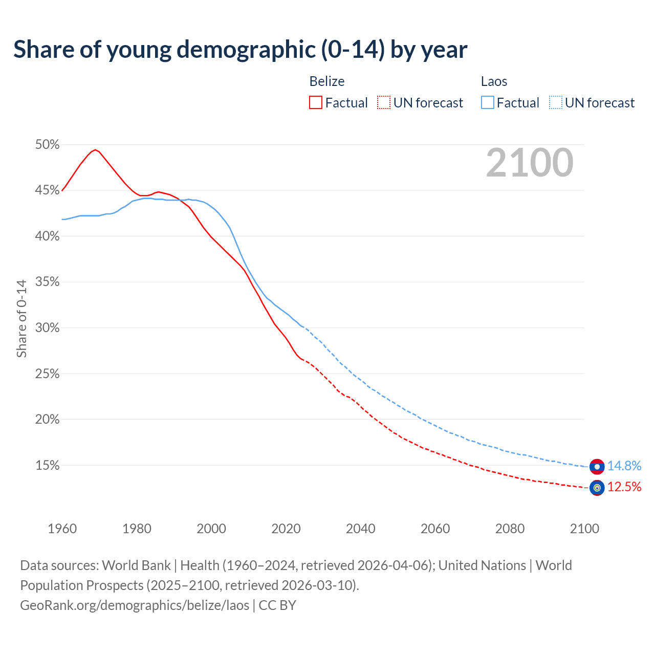 - The share of young demographic (0-15 years old) in Belize is 26.6% vs 30.2% in Laos.