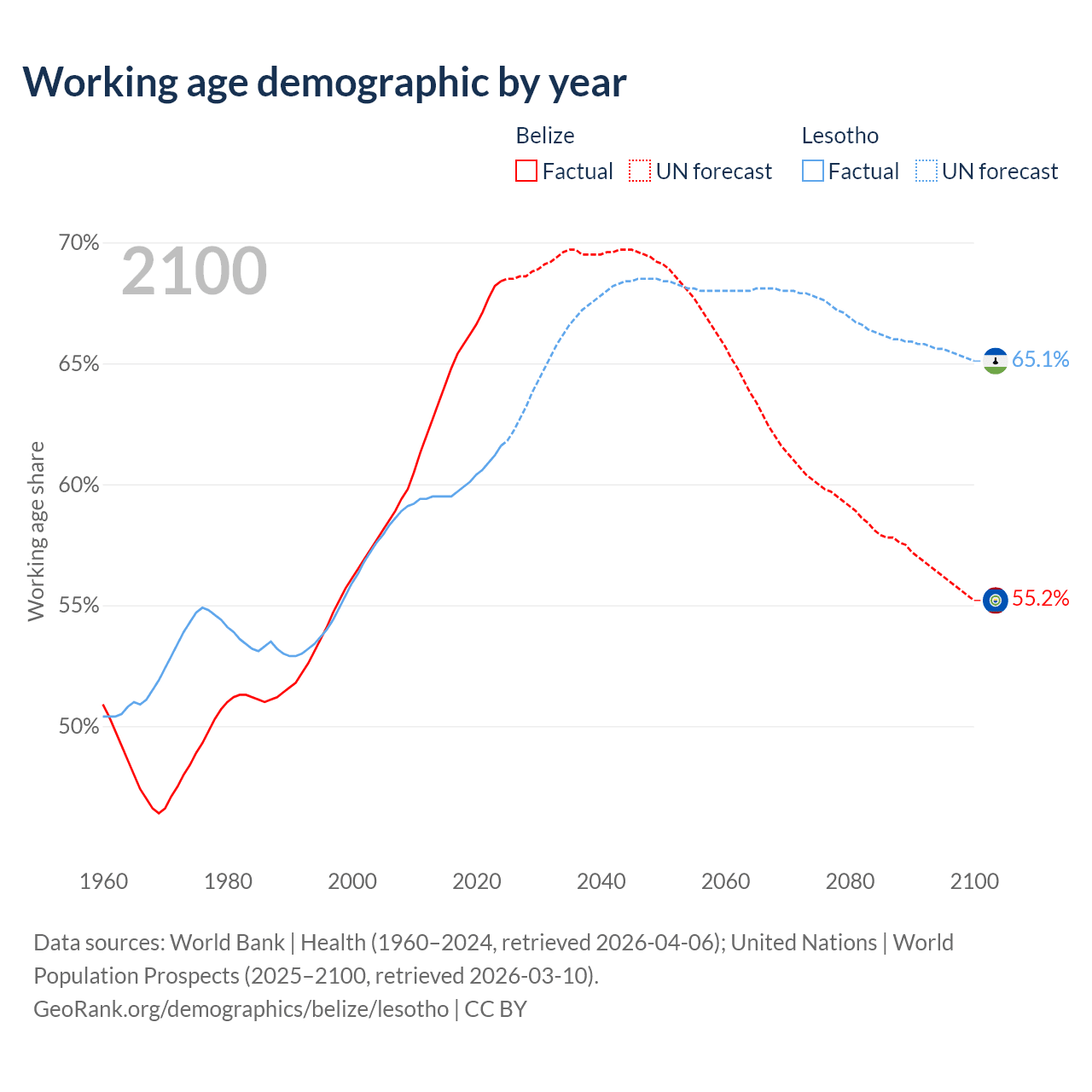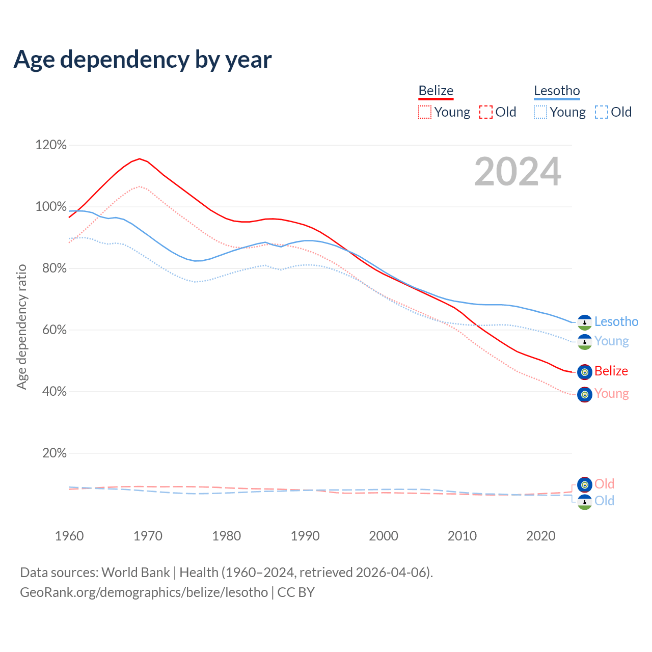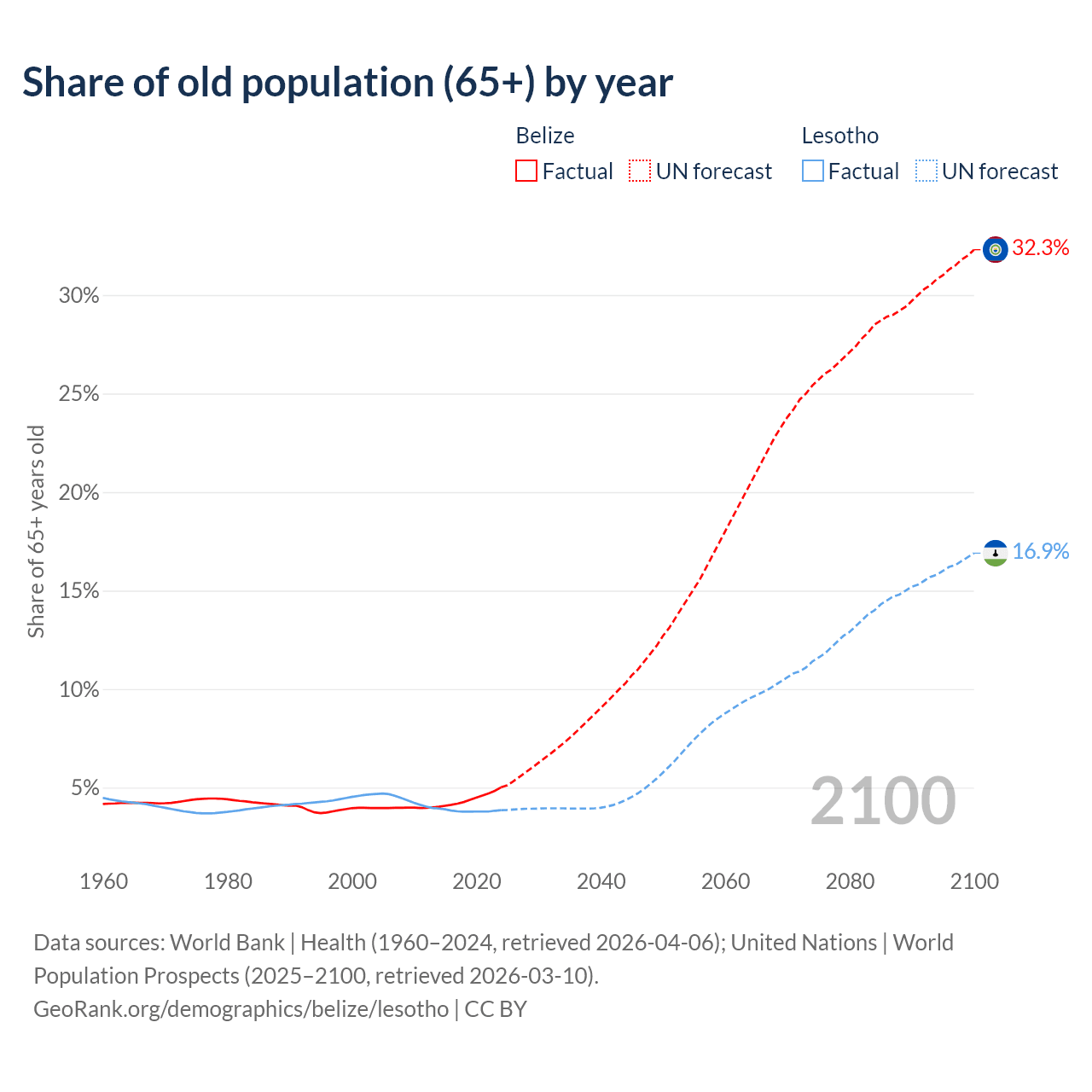 - The share of old-age demographic (65+) in Belize is 5.02% vs 3.86% in Lesotho.