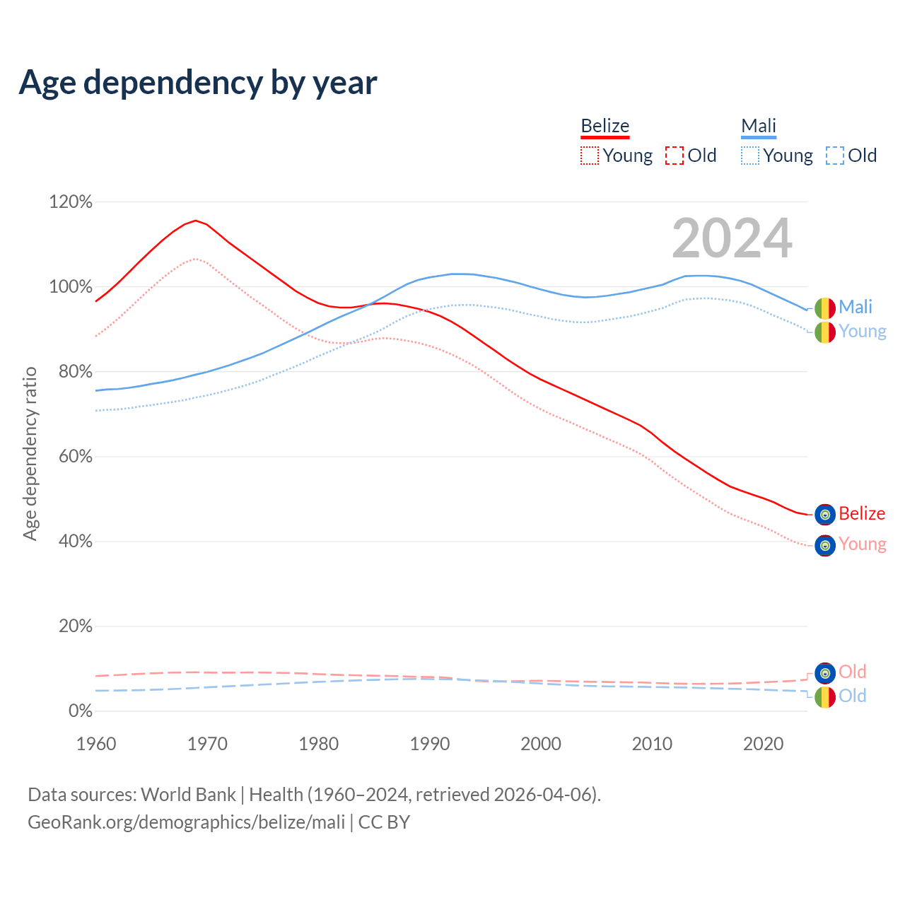 - The share of old-age demographic (65+) in Belize is 5.02% vs 2.38% in Mali.
