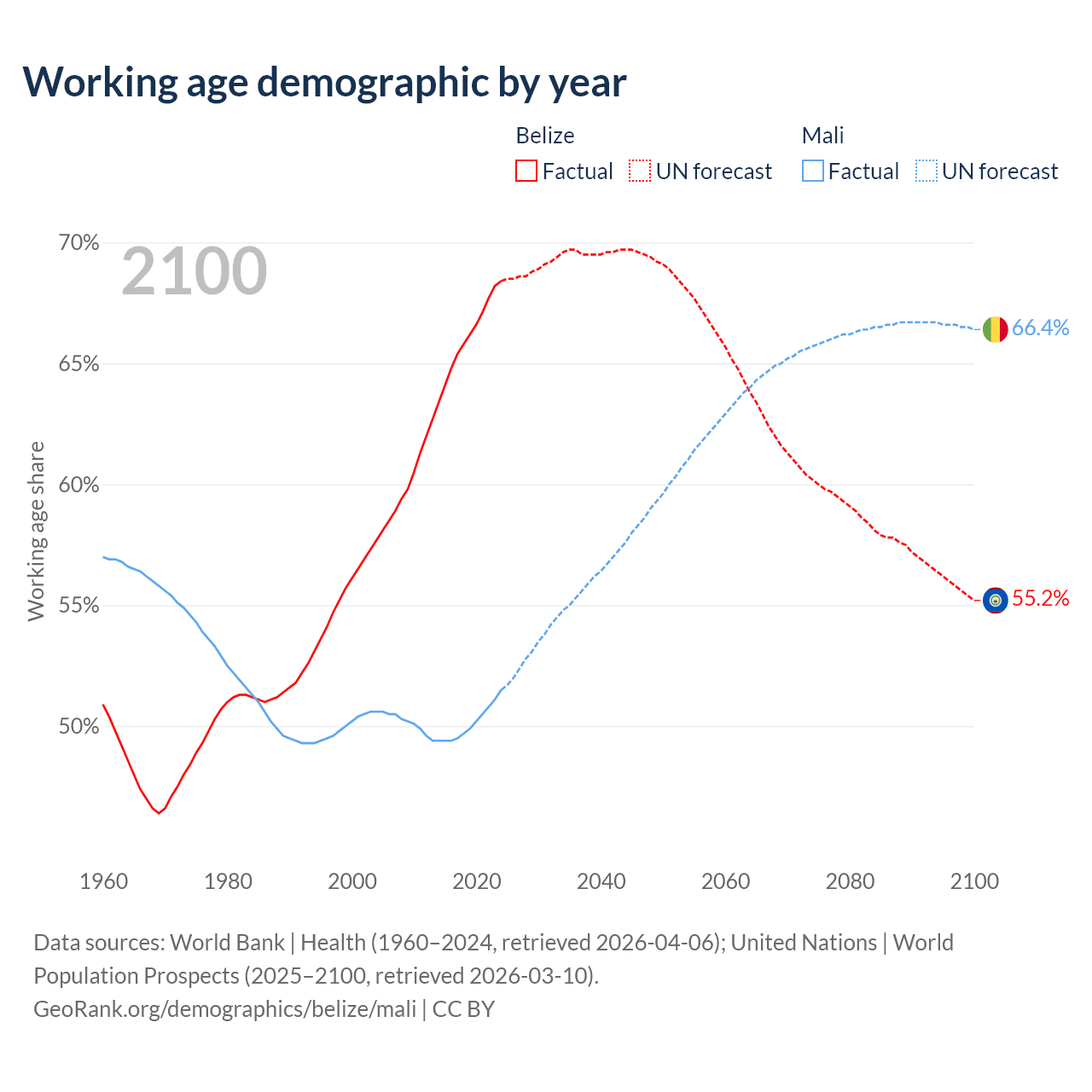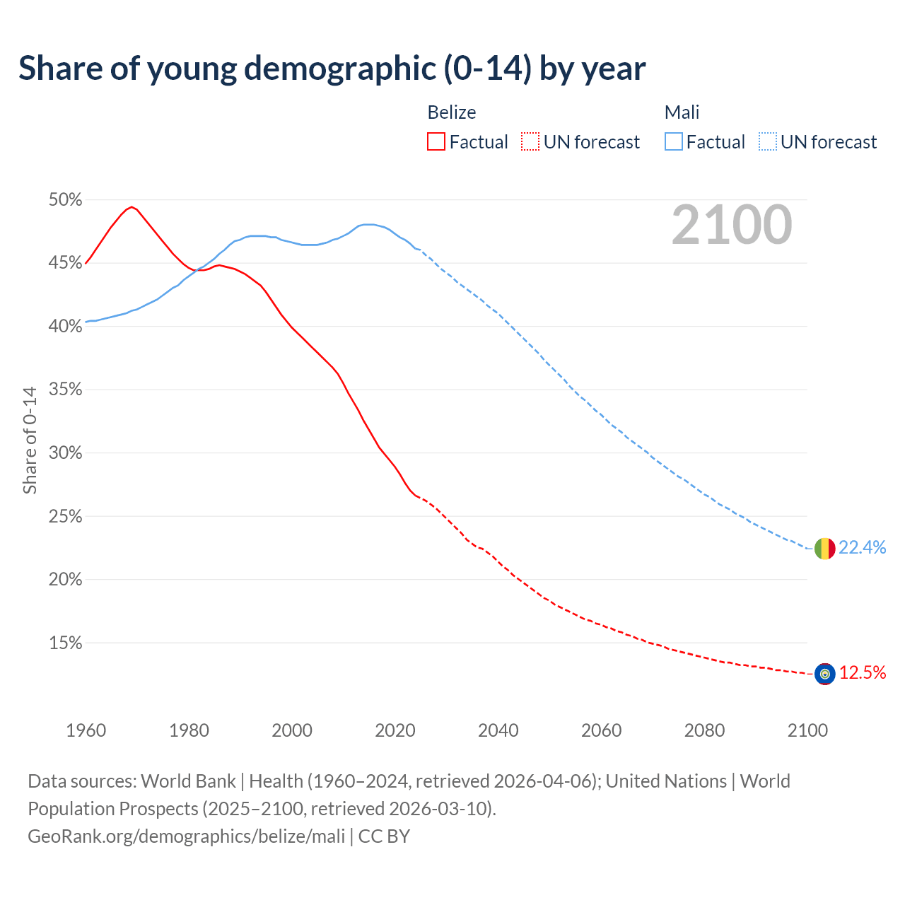 - The share of young demographic (0-15 years old) in Belize is 26.6% vs 46.1% in Mali.