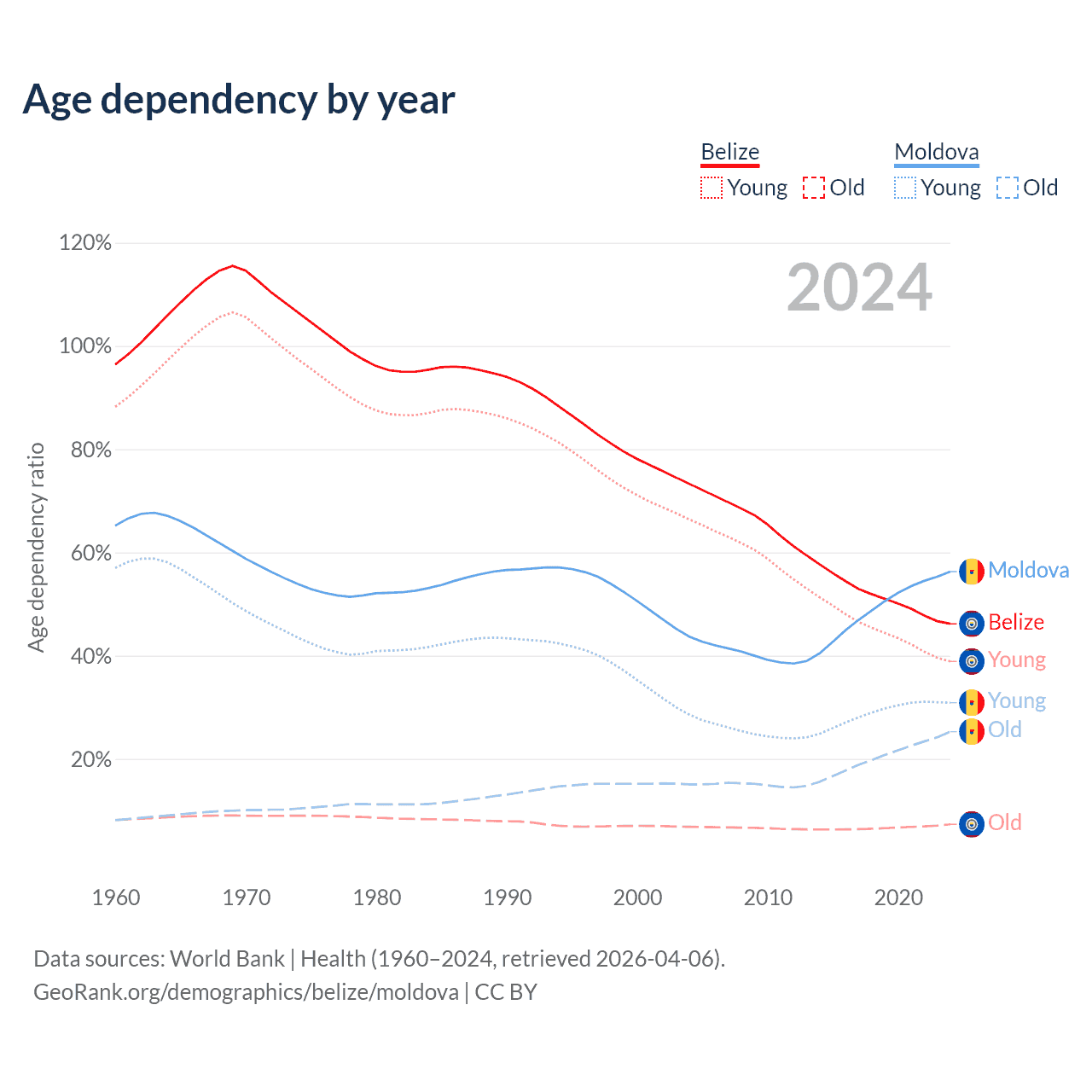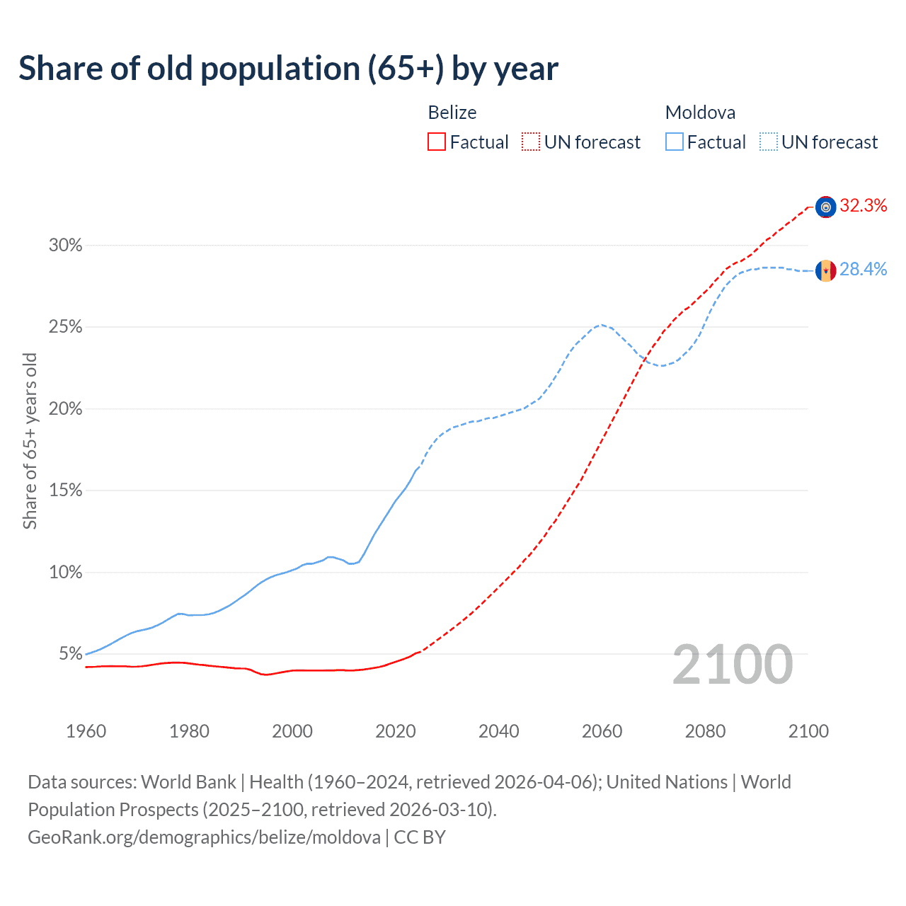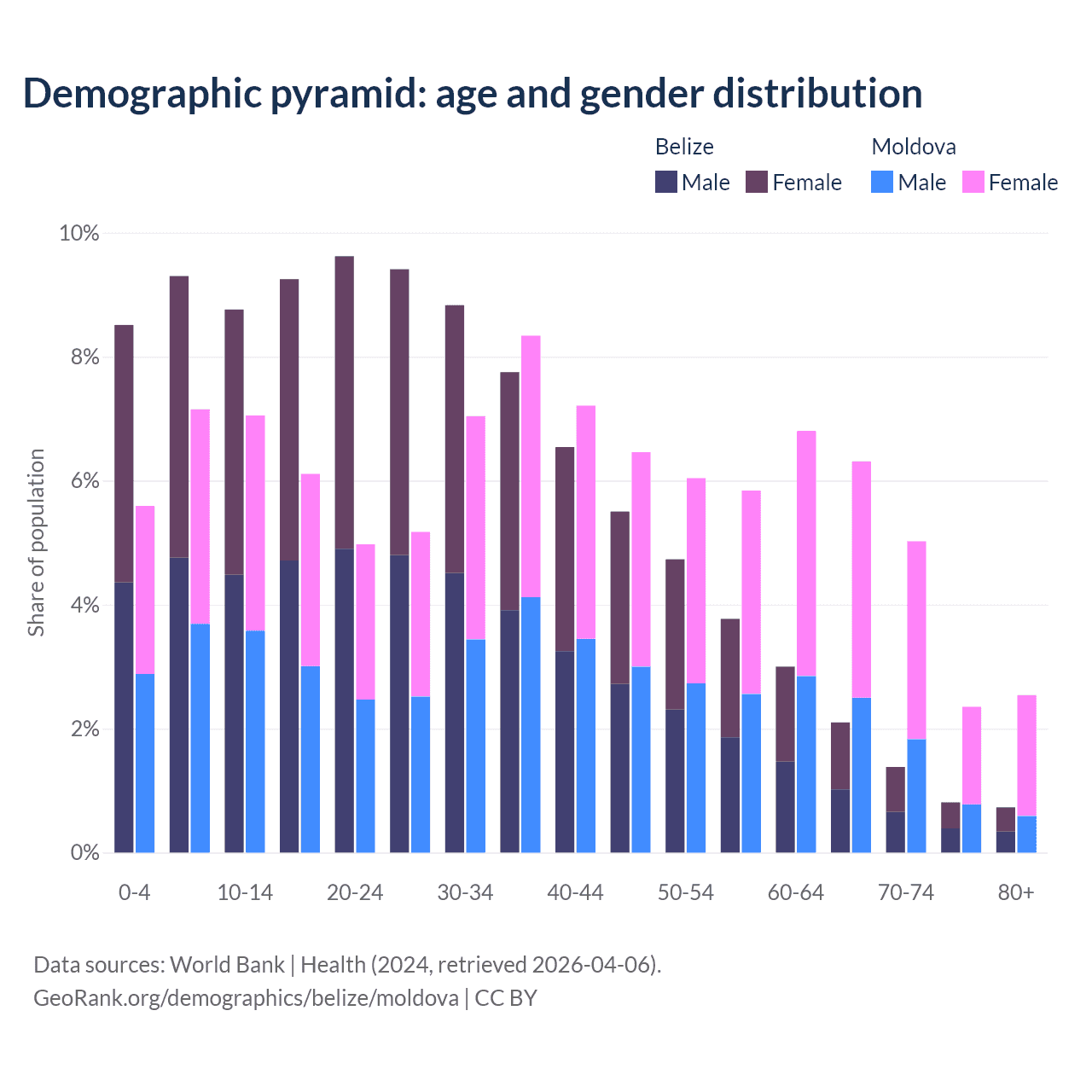 - The share of old-age demographic (65+) in Belize is 5.02% vs 16.2% in Moldova.