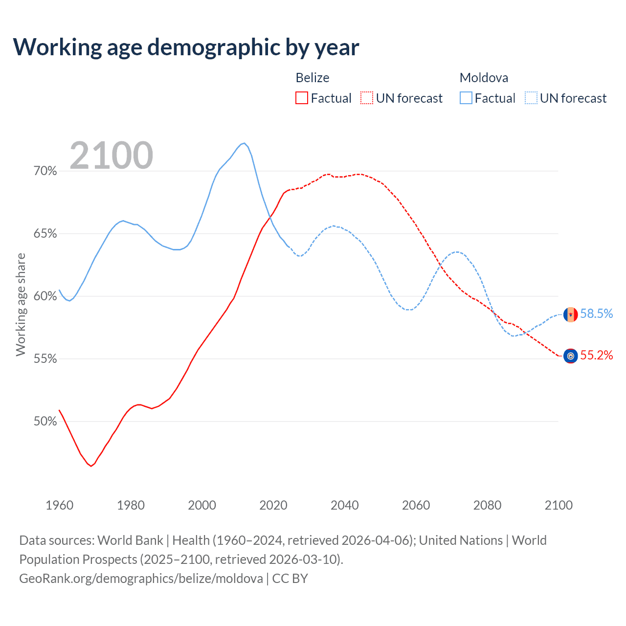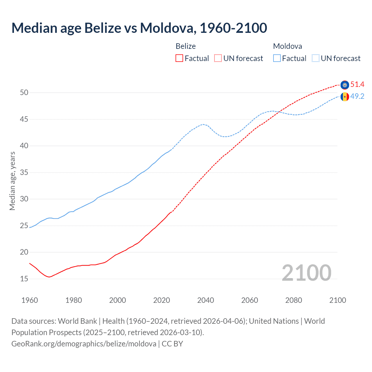 Median age Belize vs Moldova, 1960-2100
