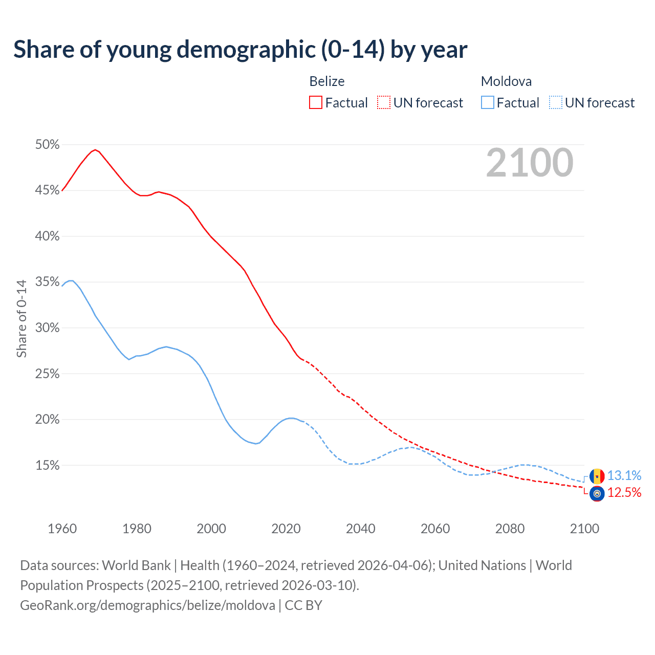 - The share of young demographic (0-15 years old) in Belize is 26.6% vs 19.8% in Moldova.